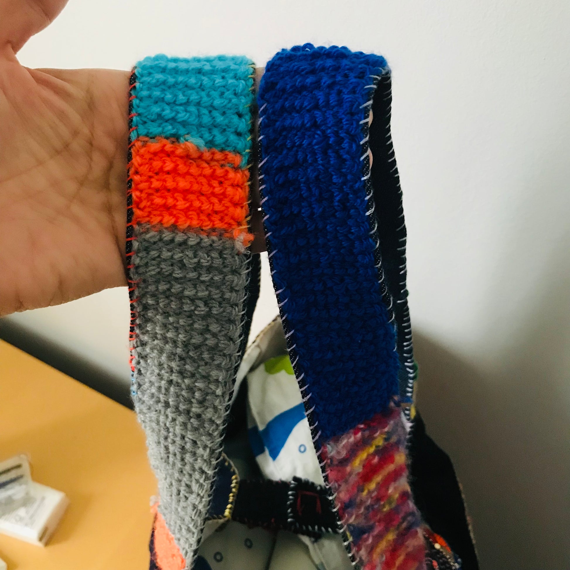 Håndtaget er lavet af afghansk strikning. Bagsiden er forstærket for at forhindre strækning.
