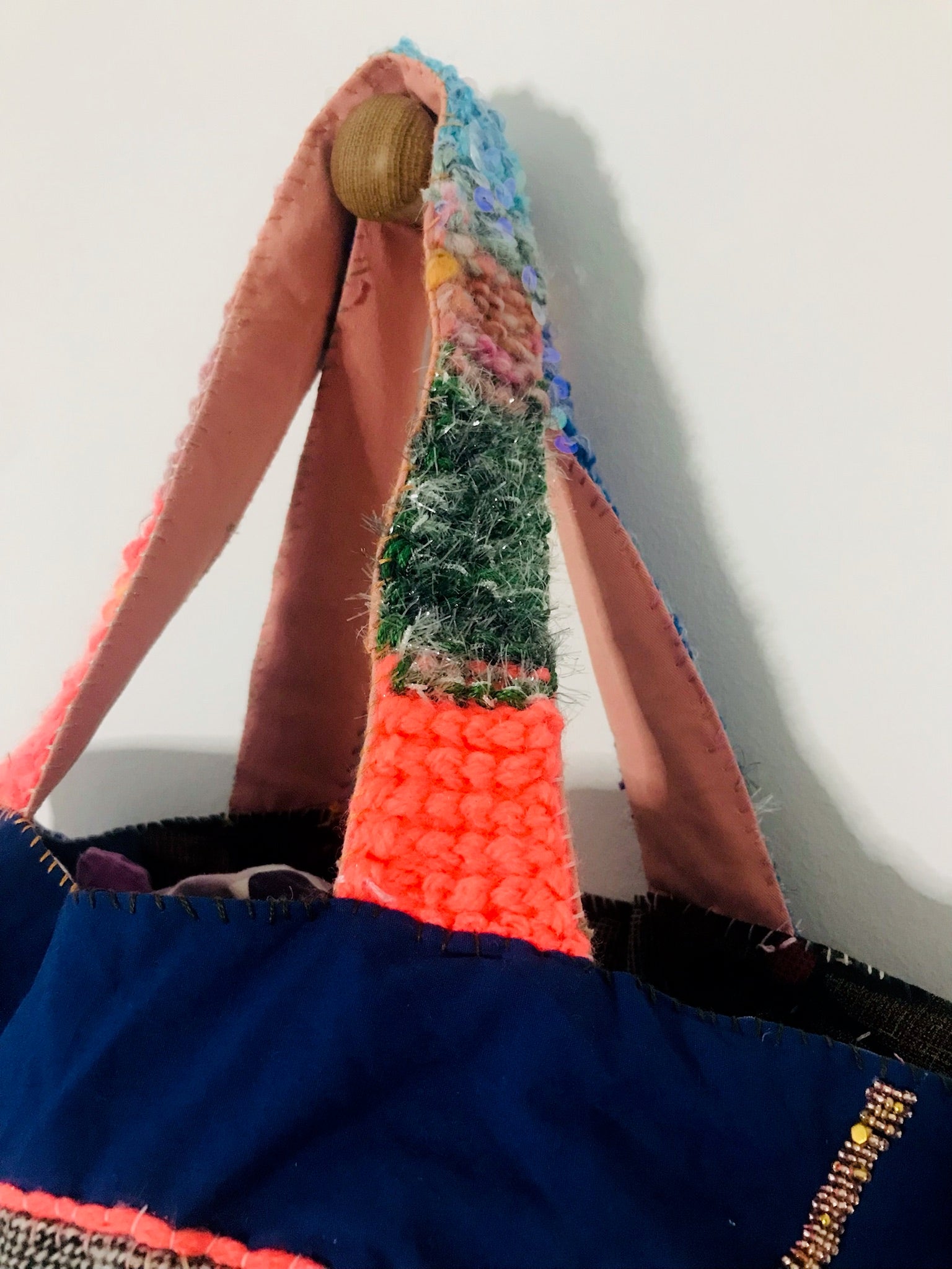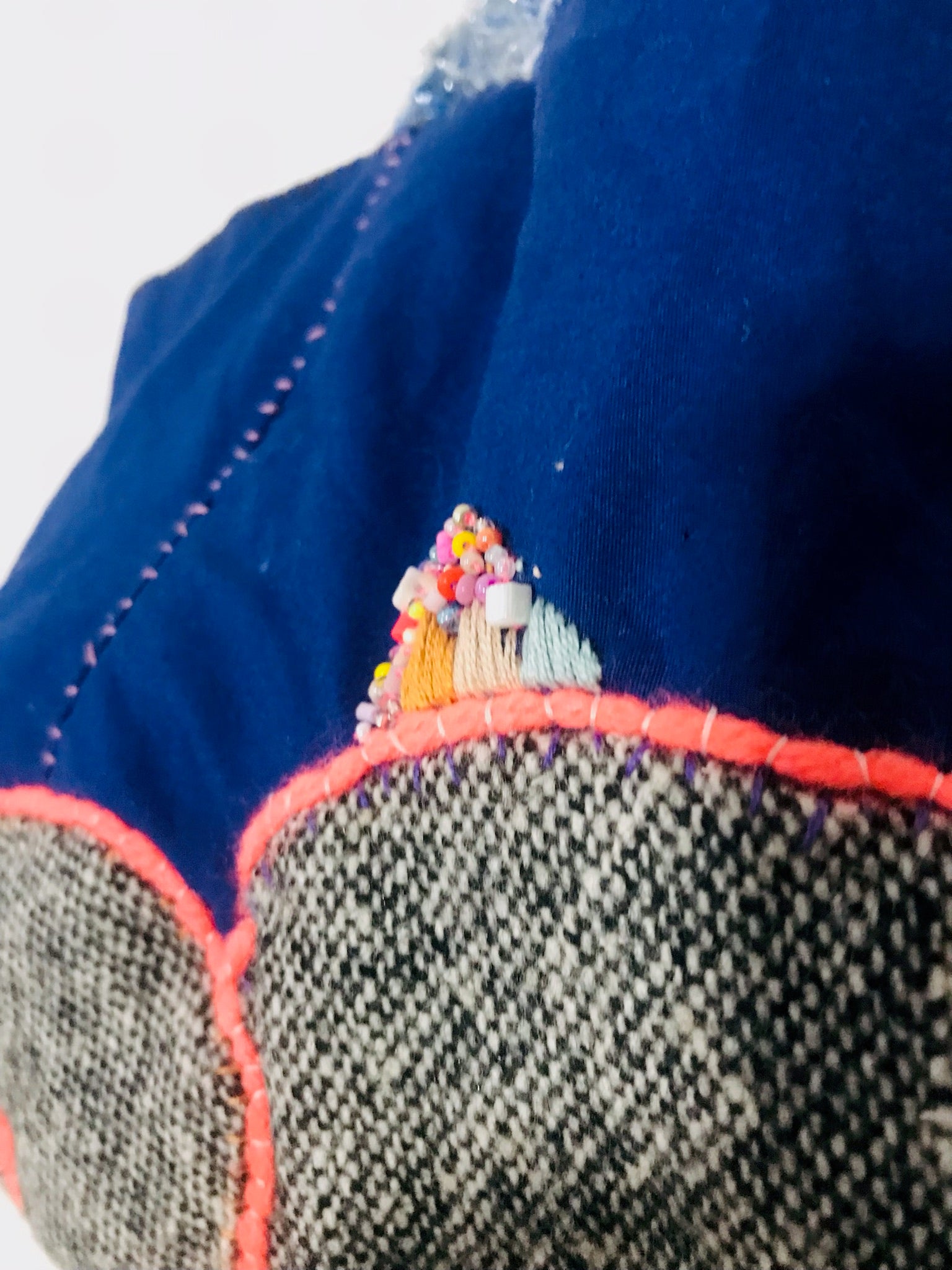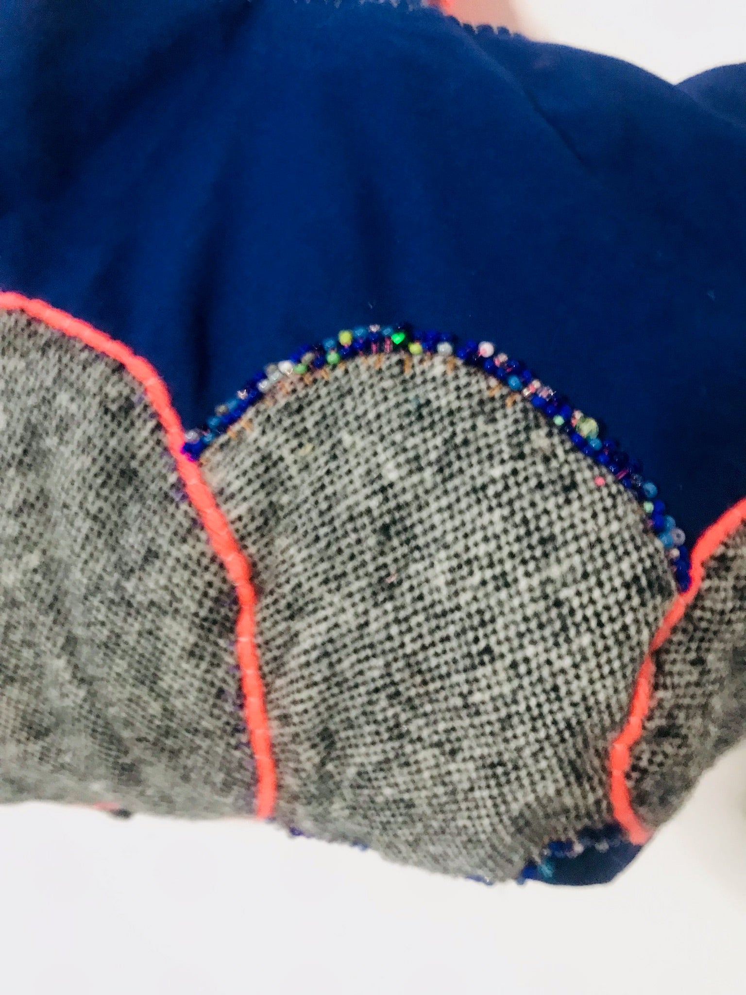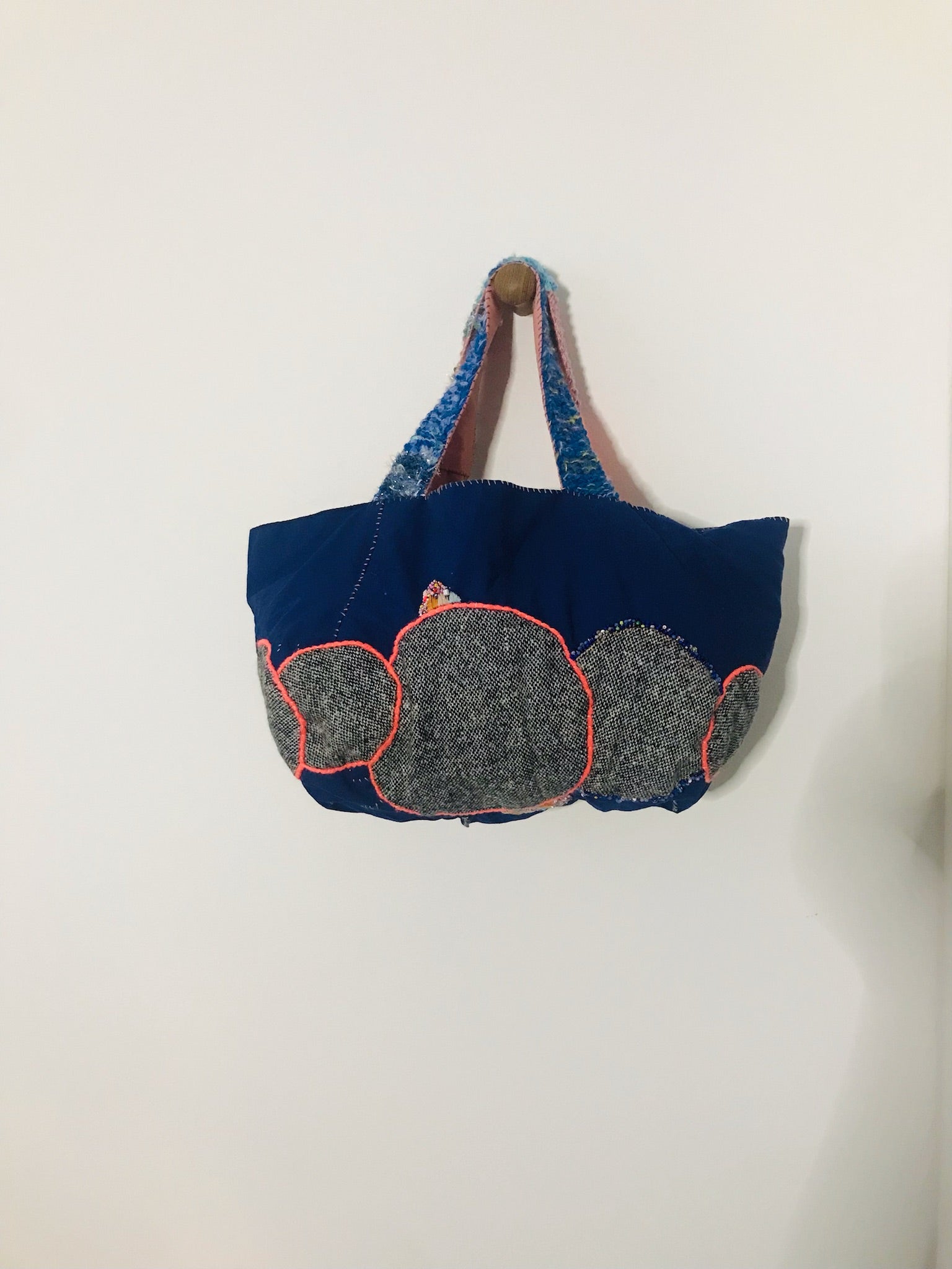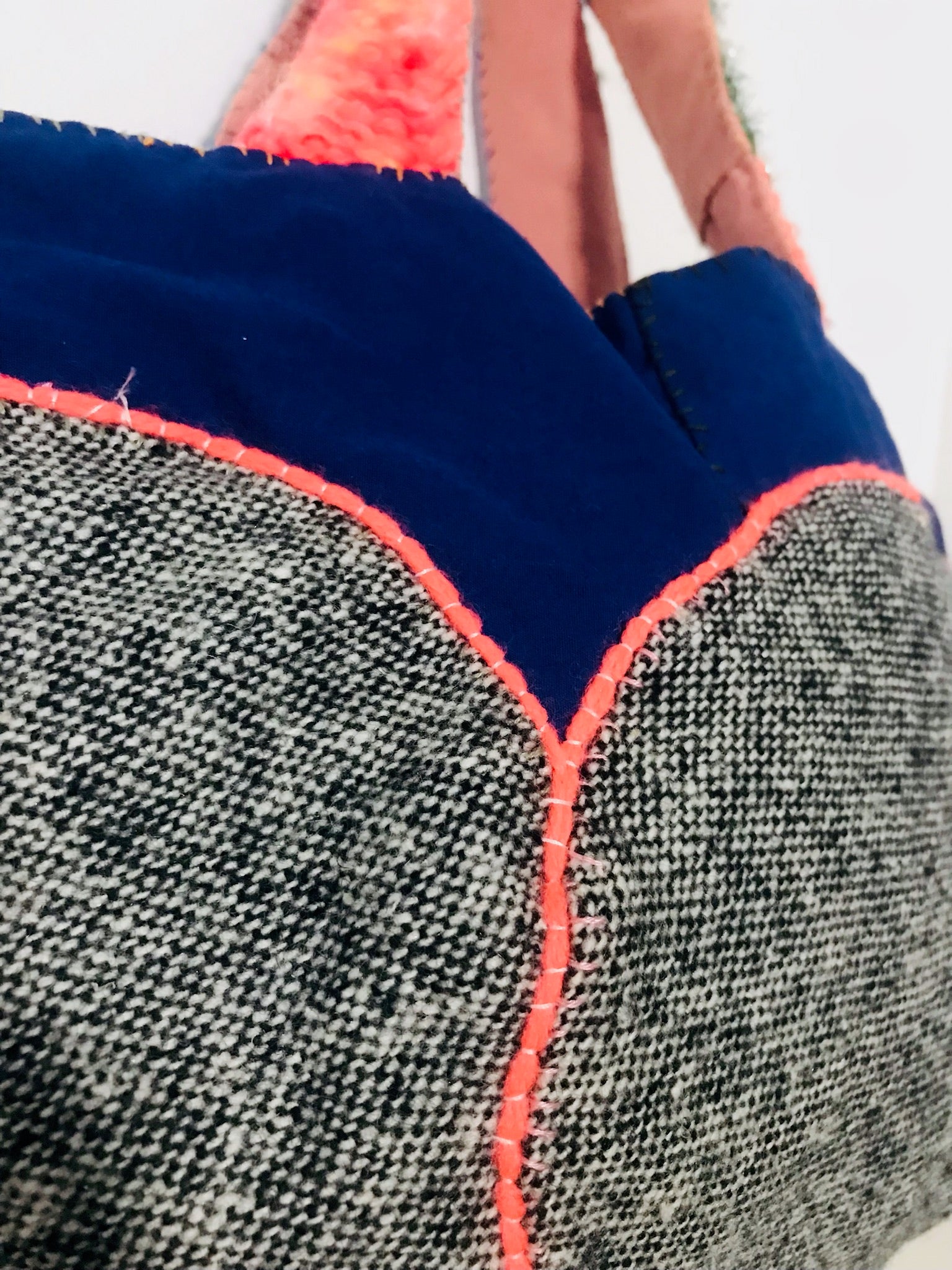 Et rundt tweed-motiv er fastgjort til en marineblå base, og neonkanter får det til at skille sig ud.