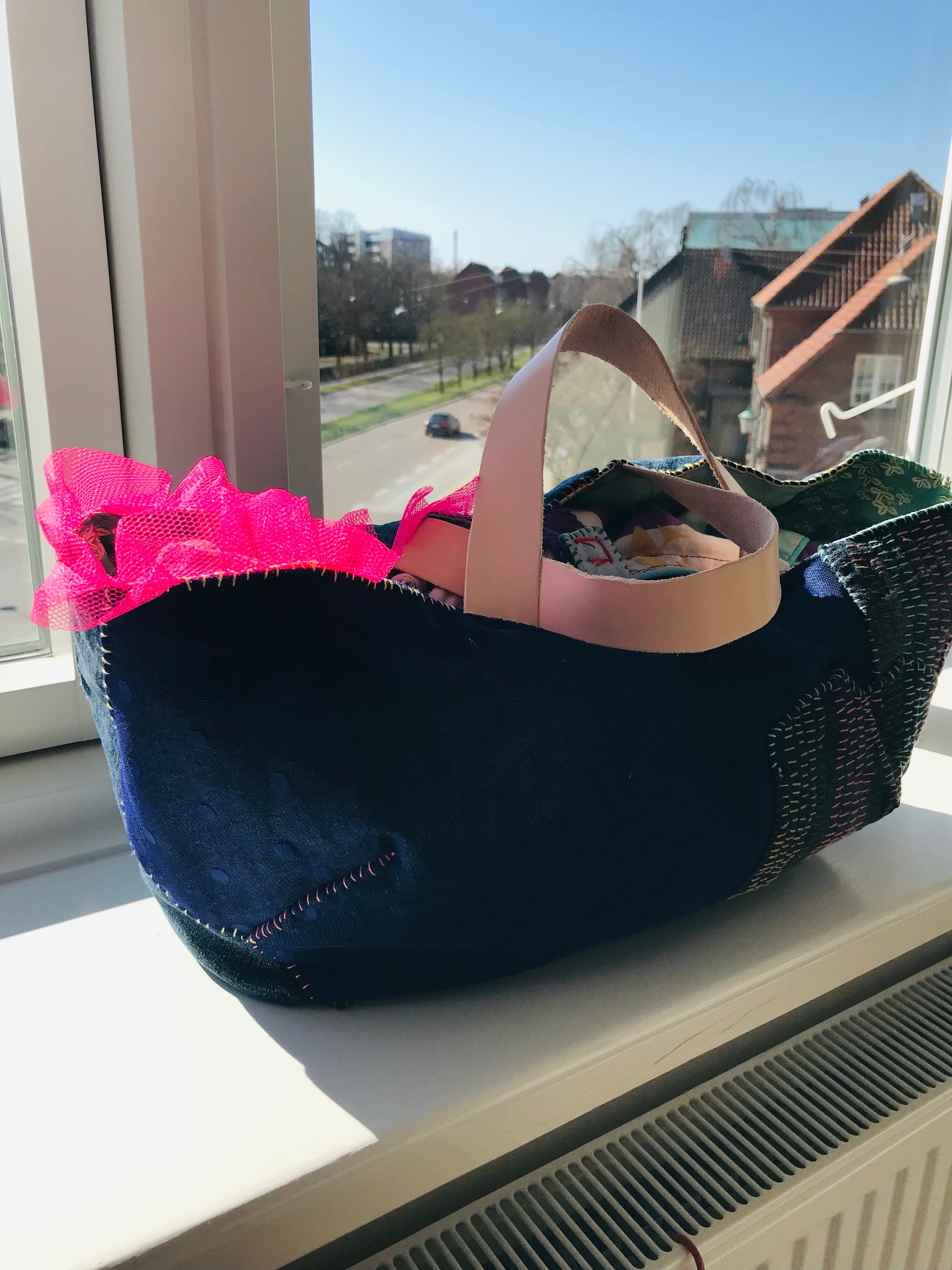 Taske håndsyet taske stof ægte læder håndtag slow fashion håndlavet 1697