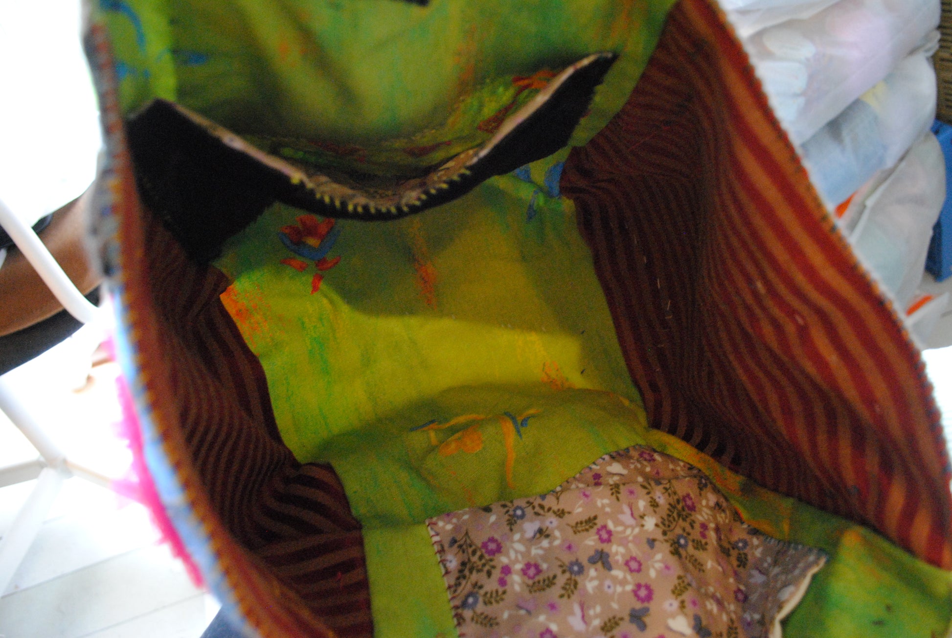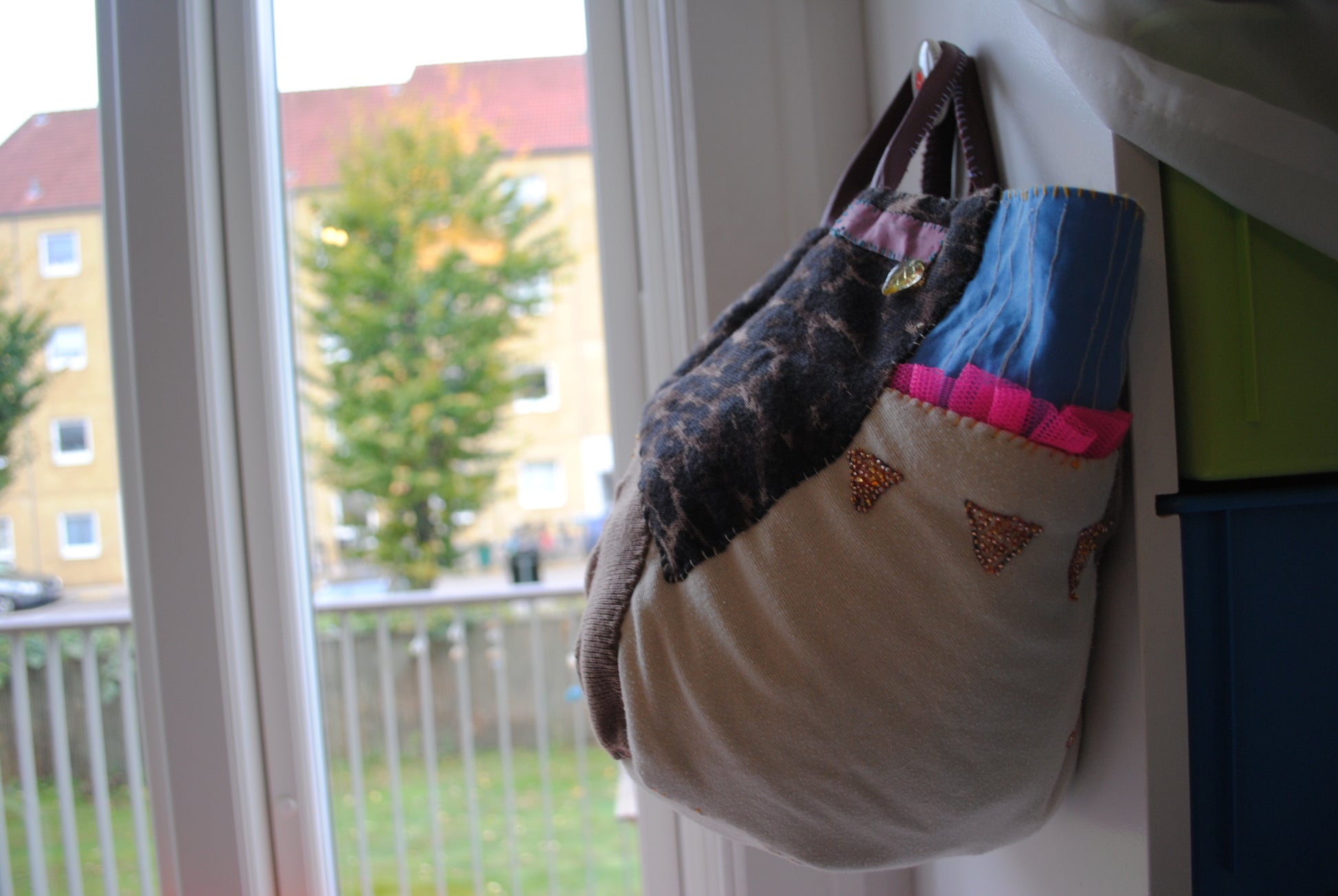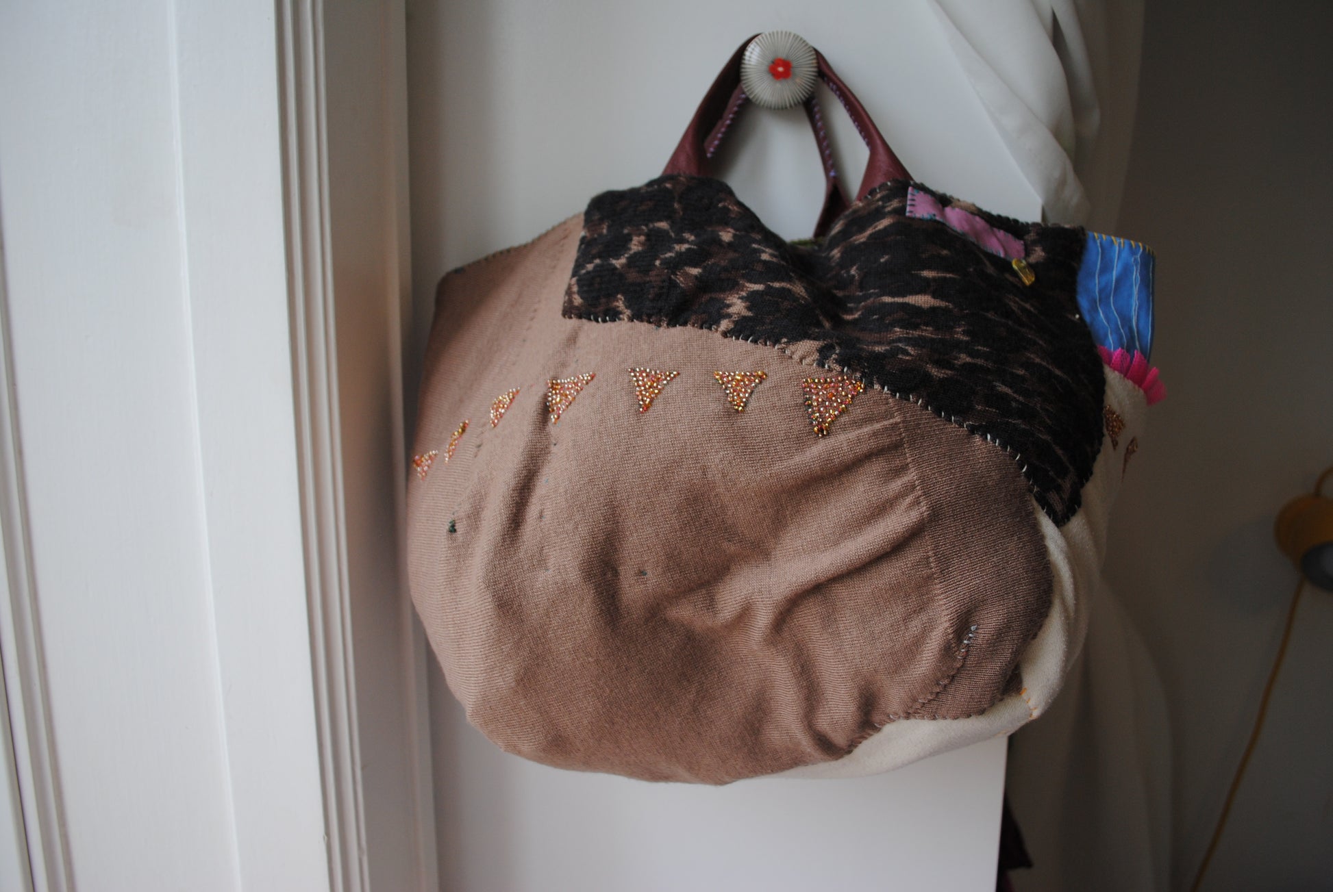 Taske håndsyet taske stof ægte læder håndtag håndlavet 1581