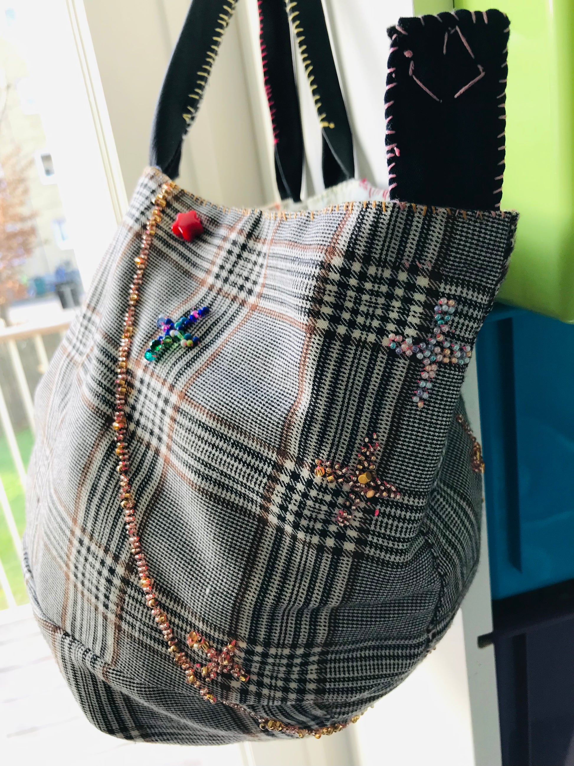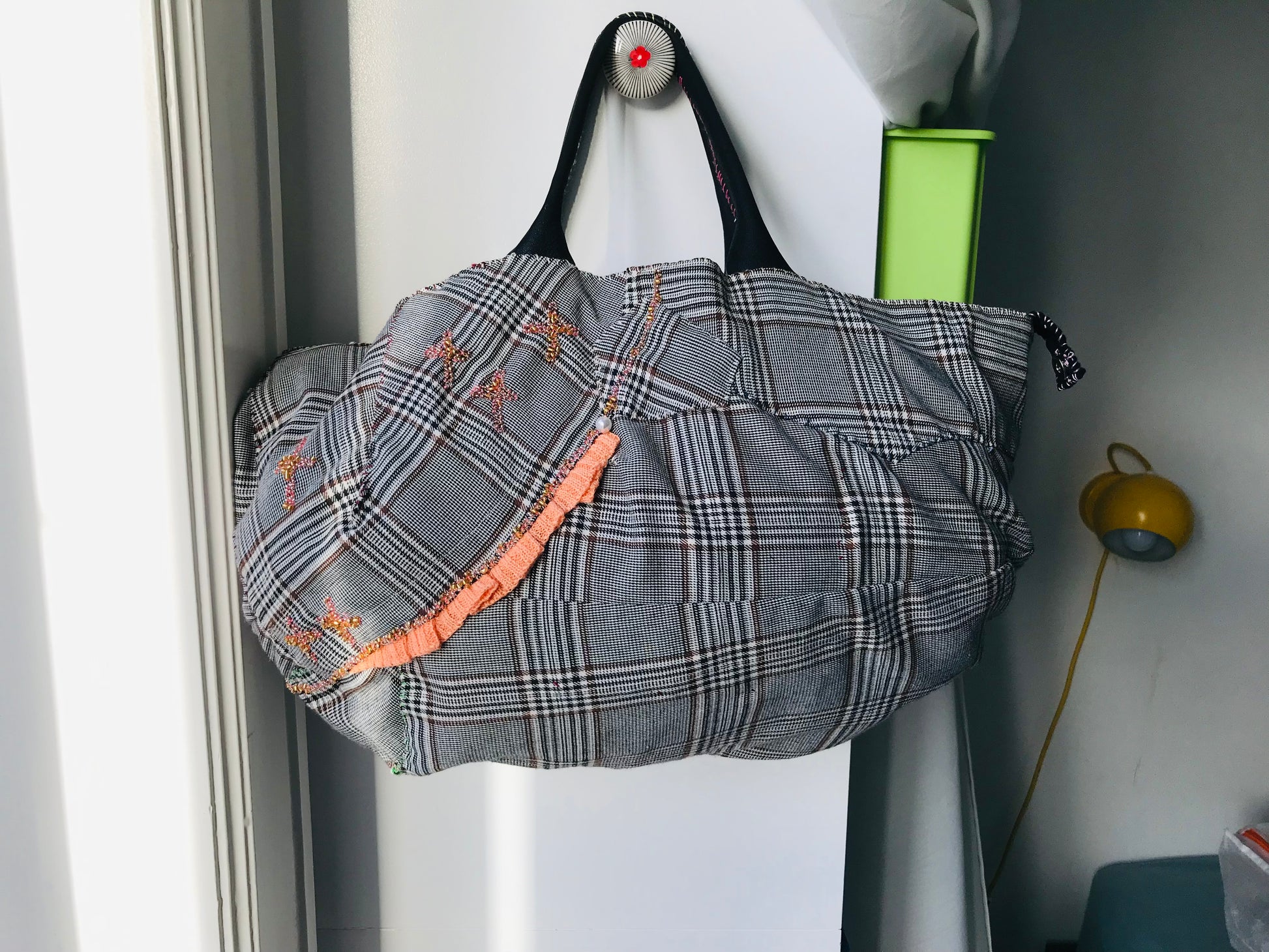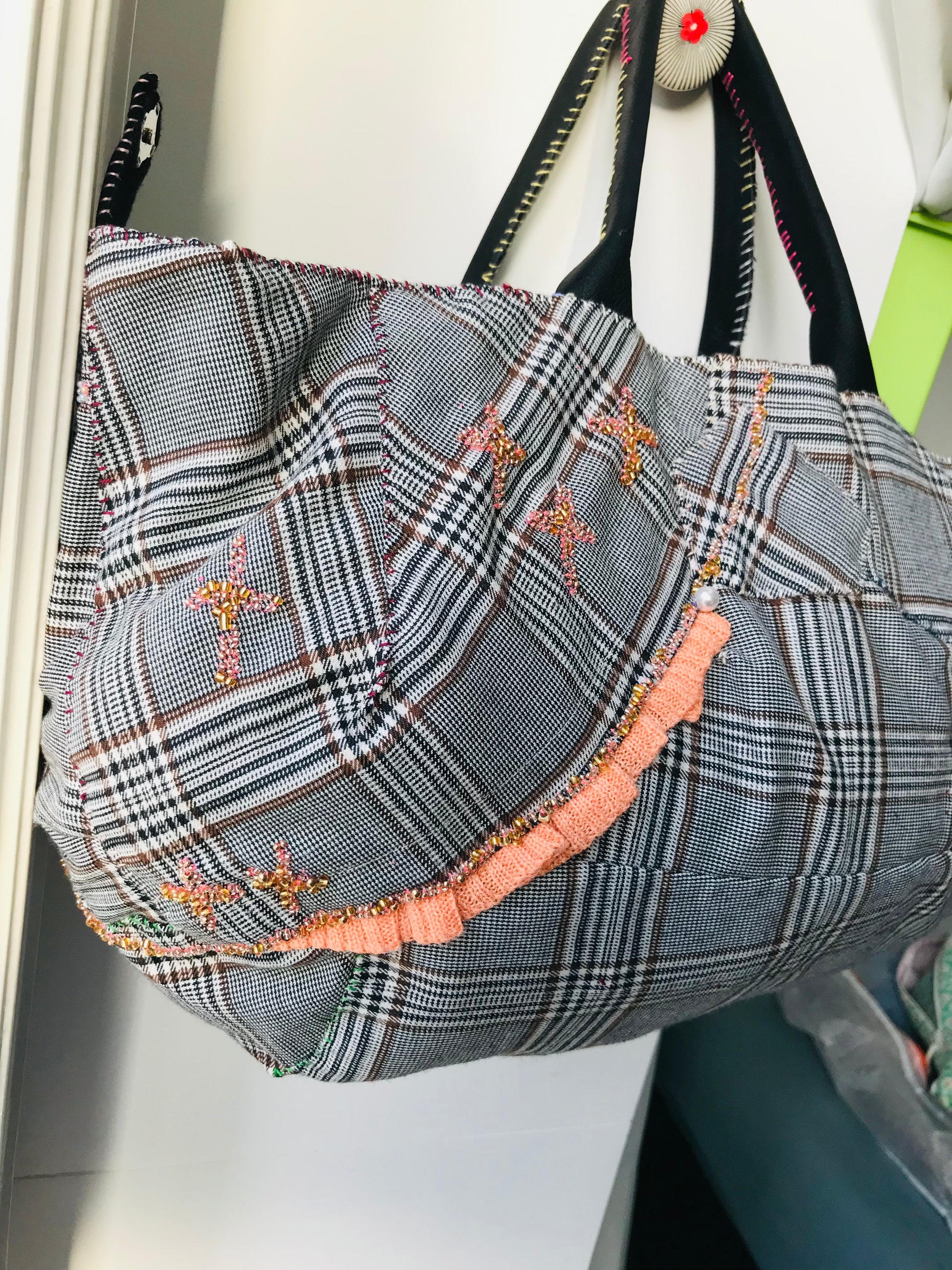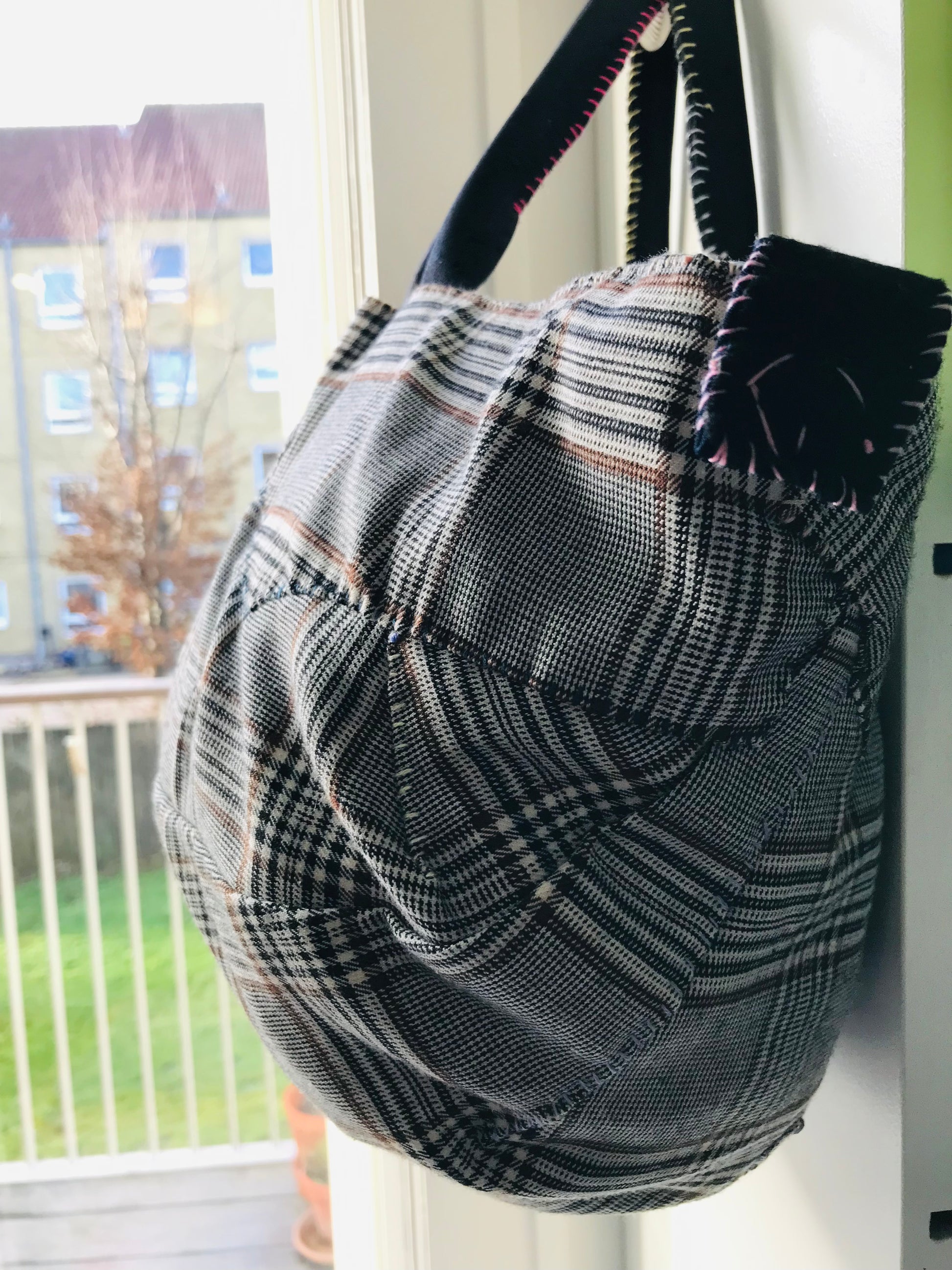 Taske håndsyet taske stof ægte læder håndtag håndlavet 1626