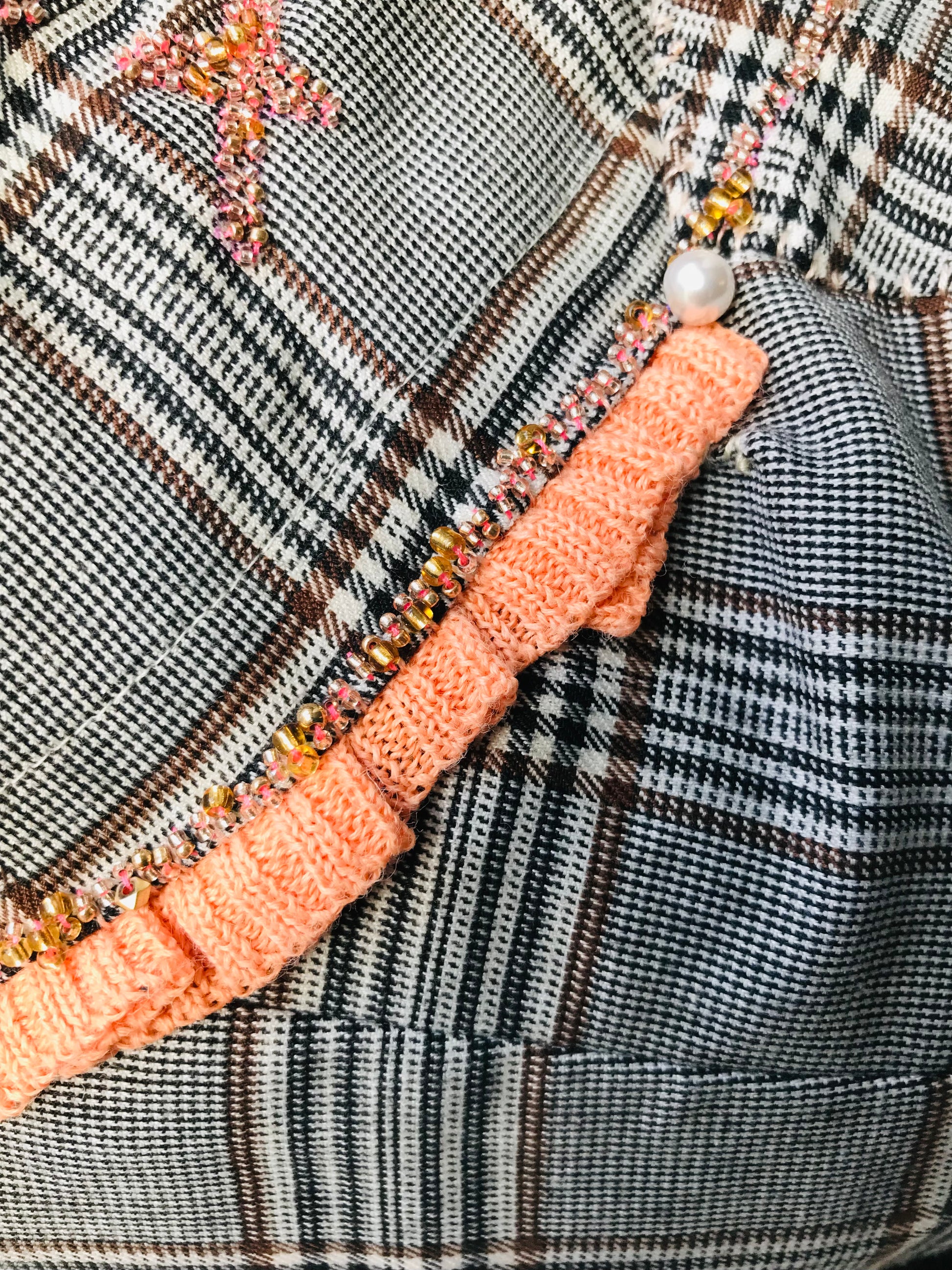Neonorange dikkedarer er klemt mellem et afdæmpet gråternet stof og dekoreret med perleperler og Kimbeads.