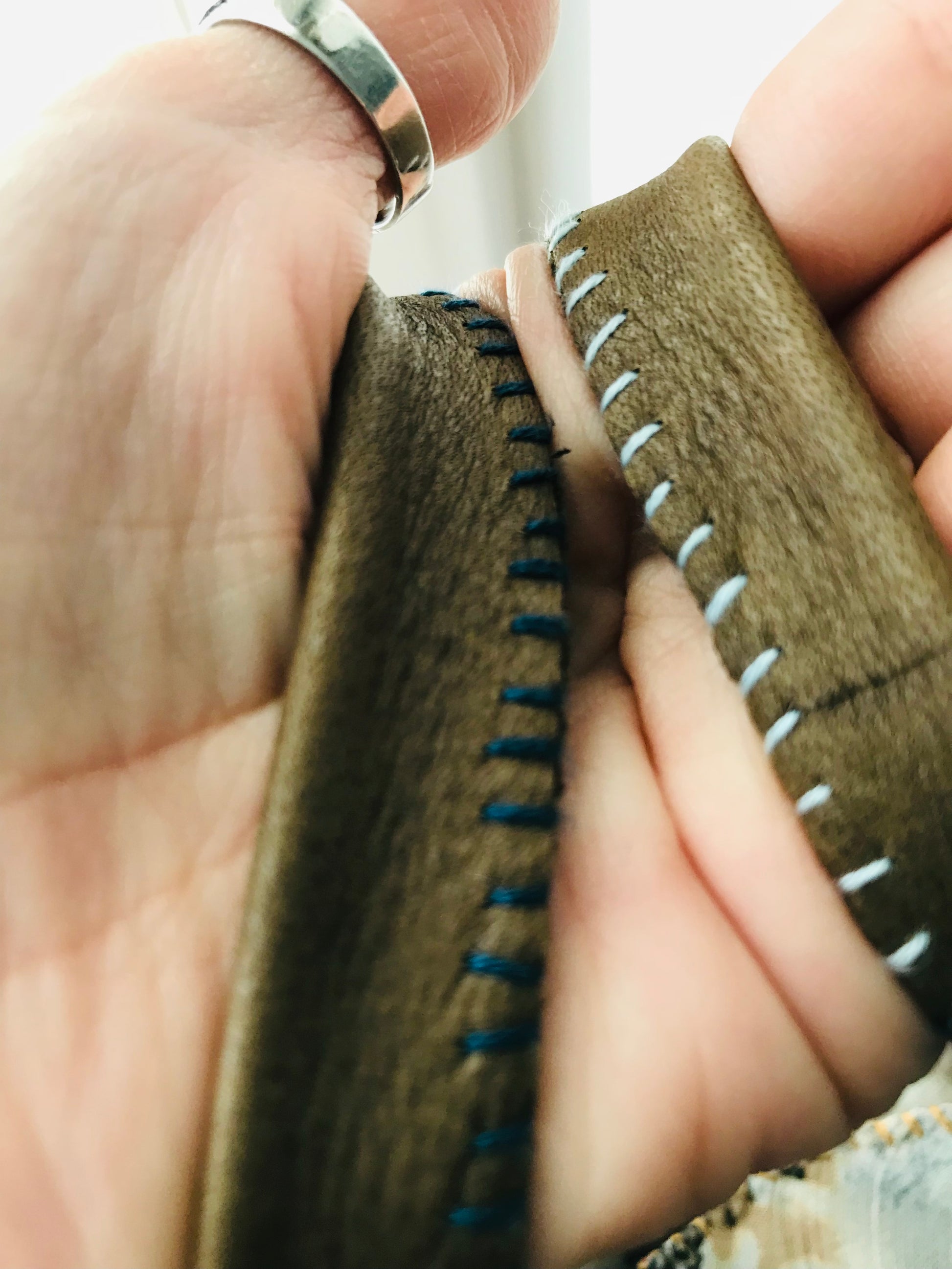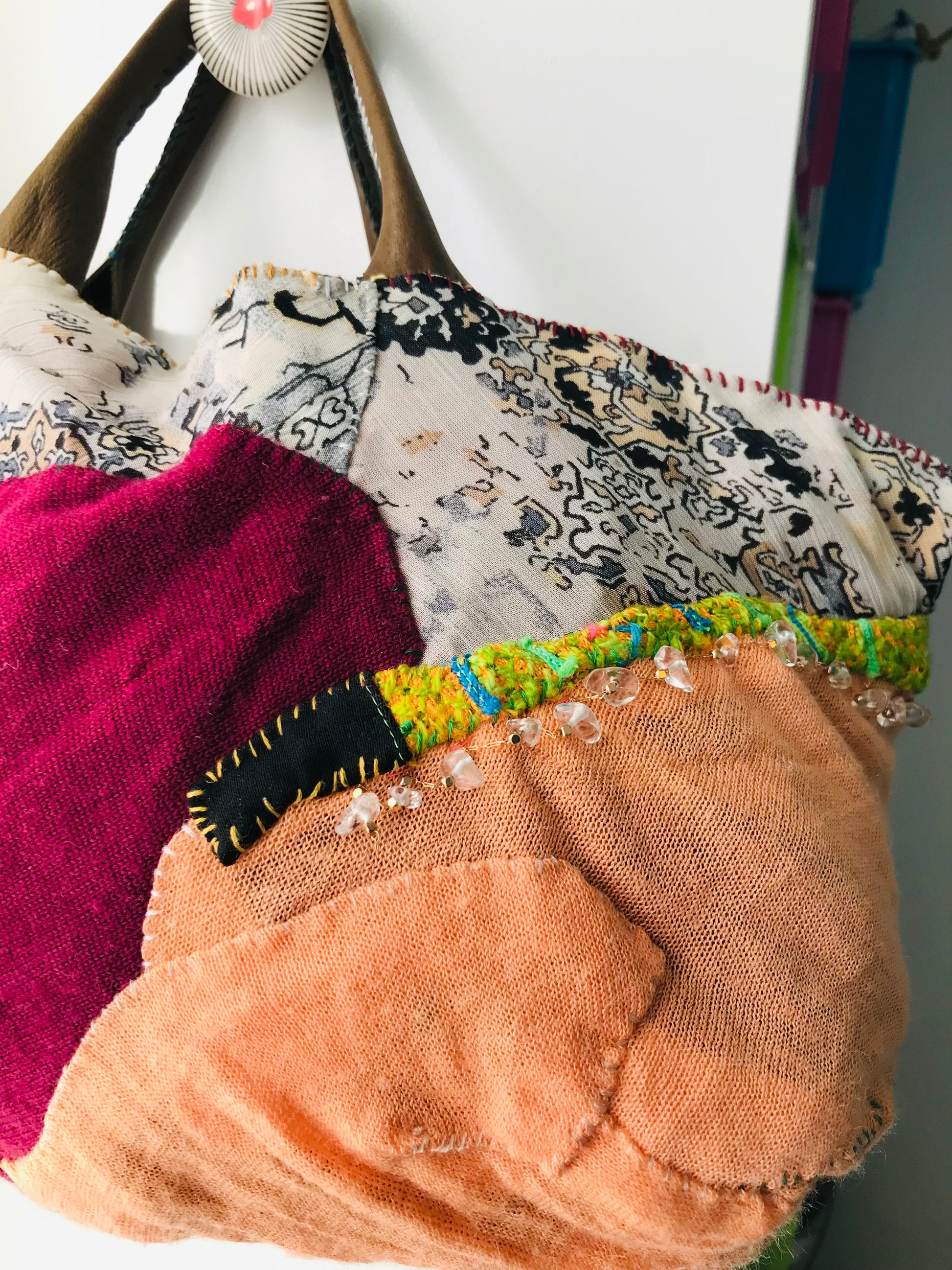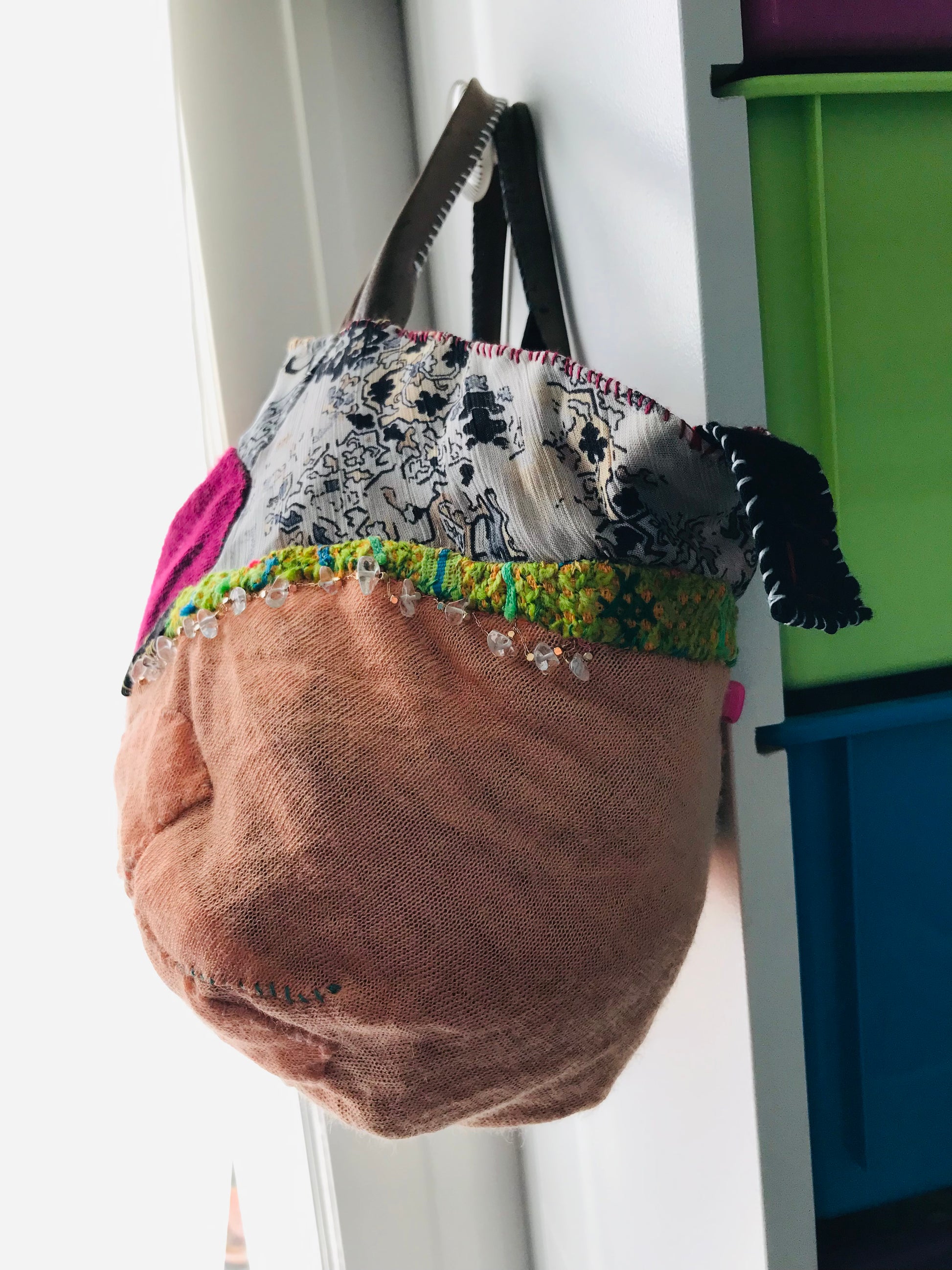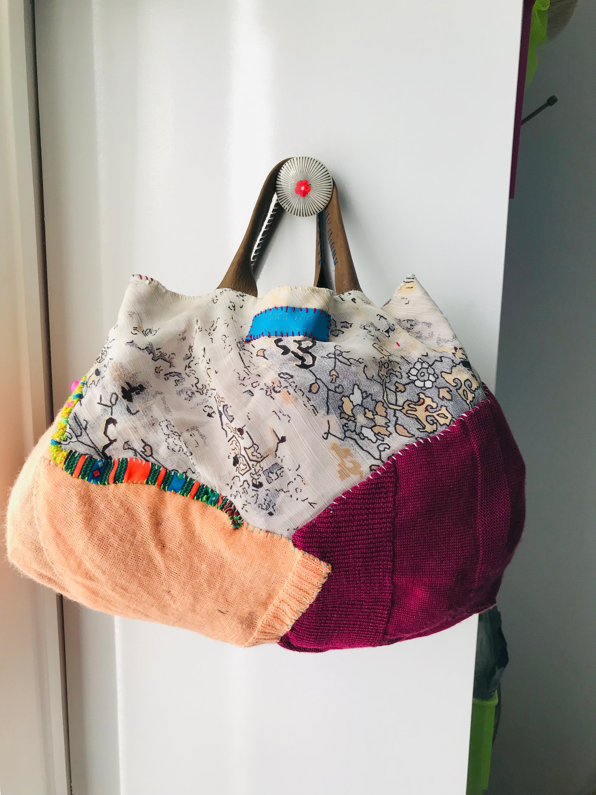 Taske håndsyet taske stof ægte læder håndtag håndlavet 1627