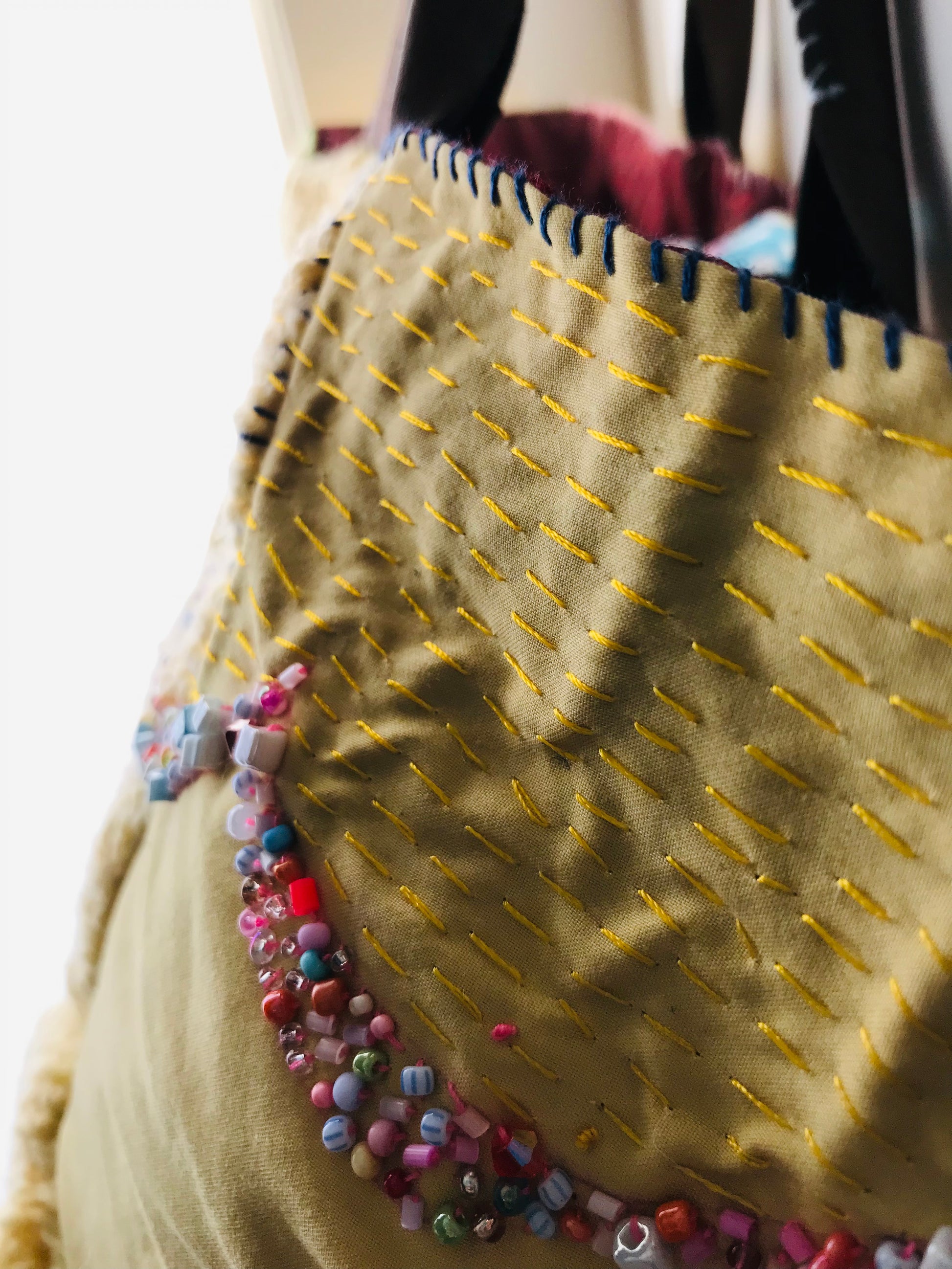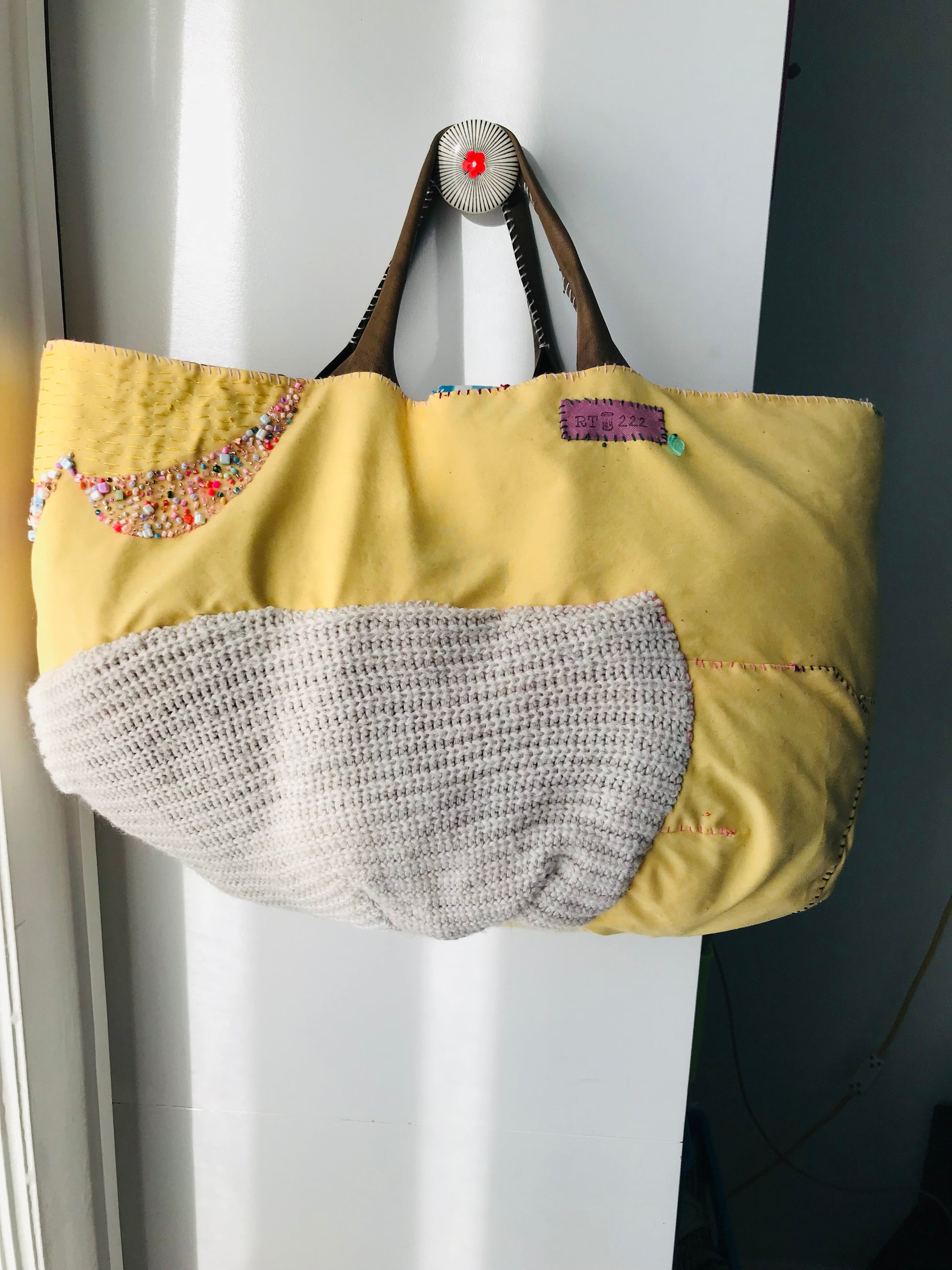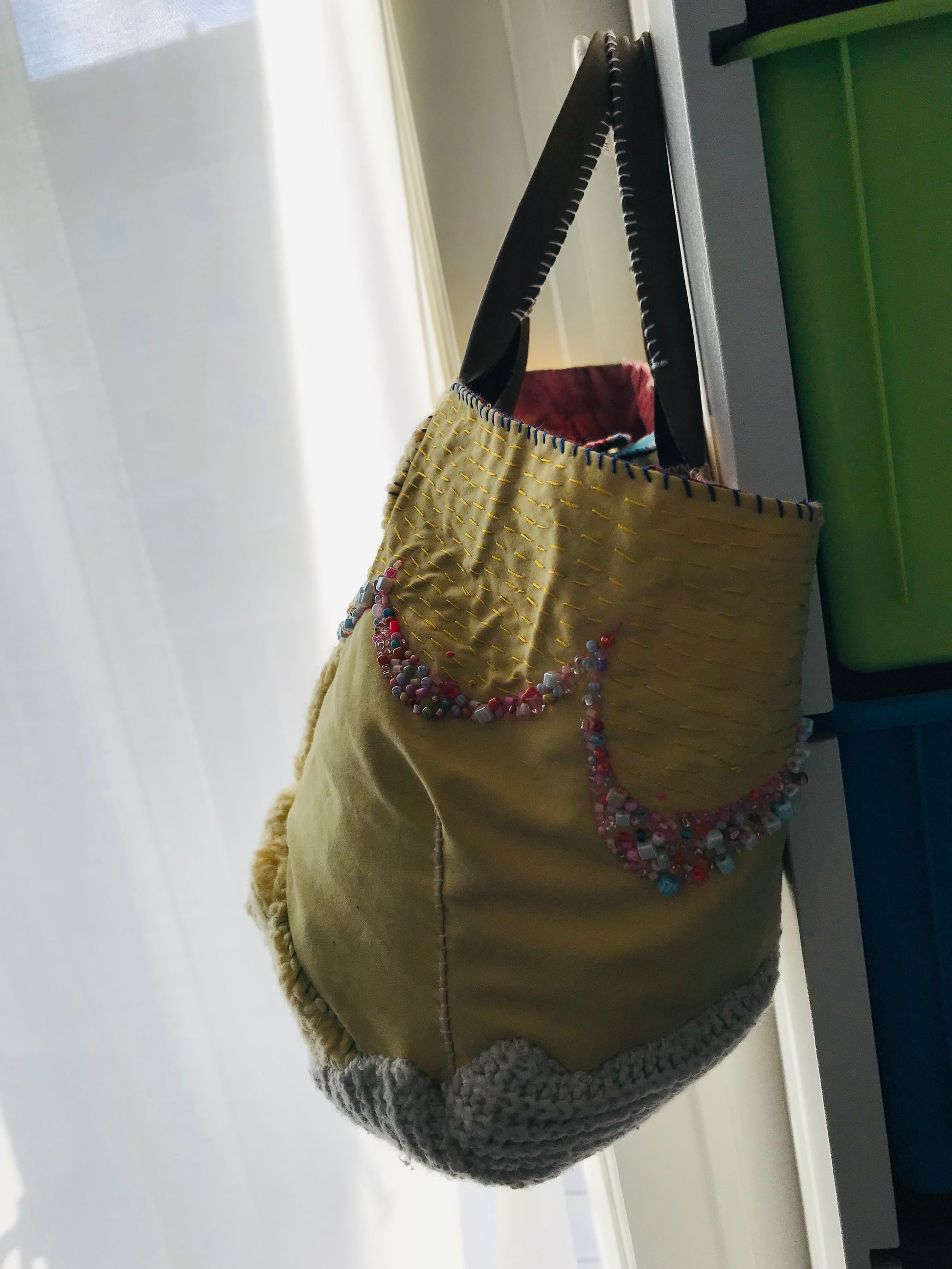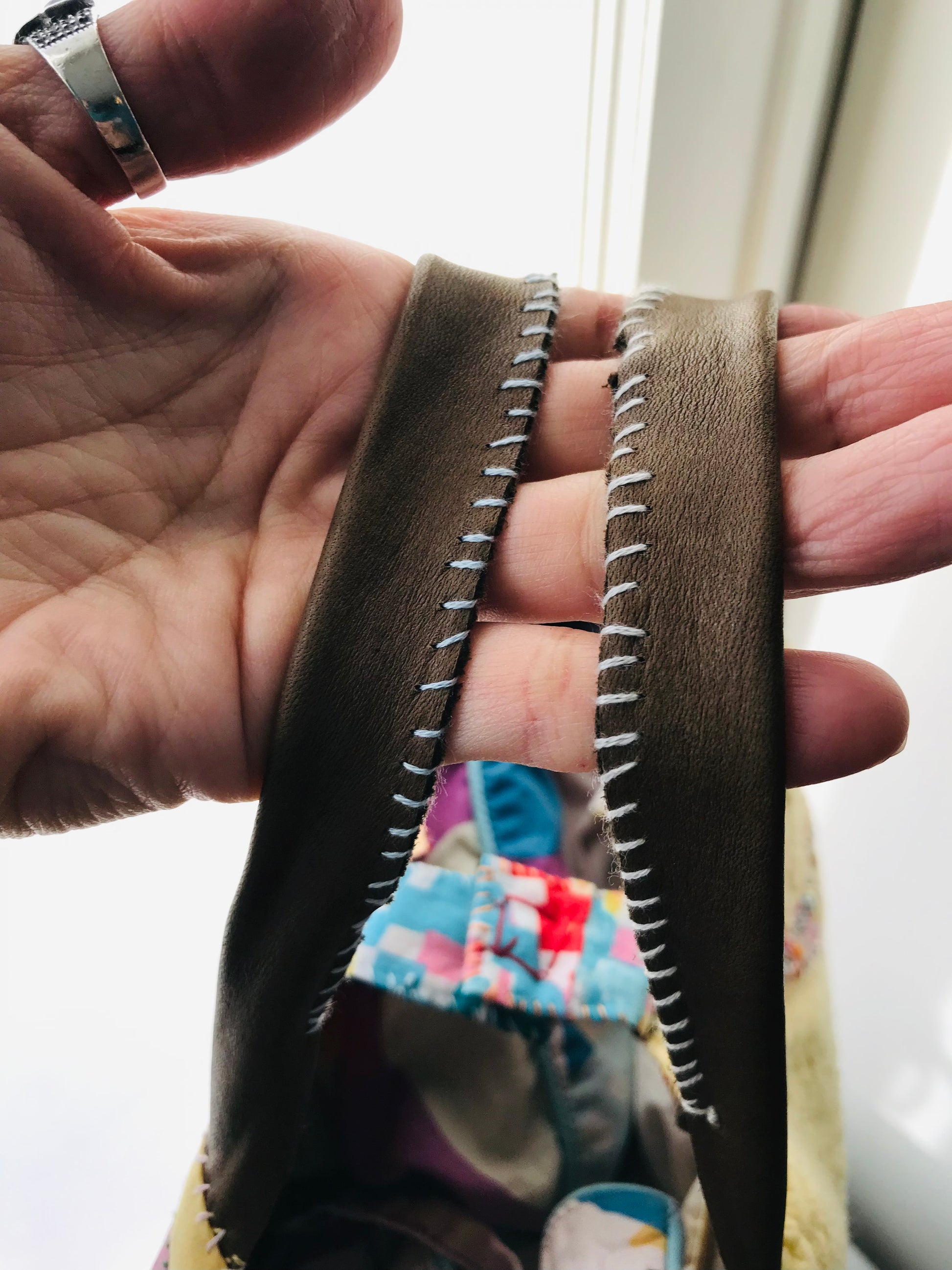 Taske håndsyet taske stof ægte læder håndtag håndlavet 1628
