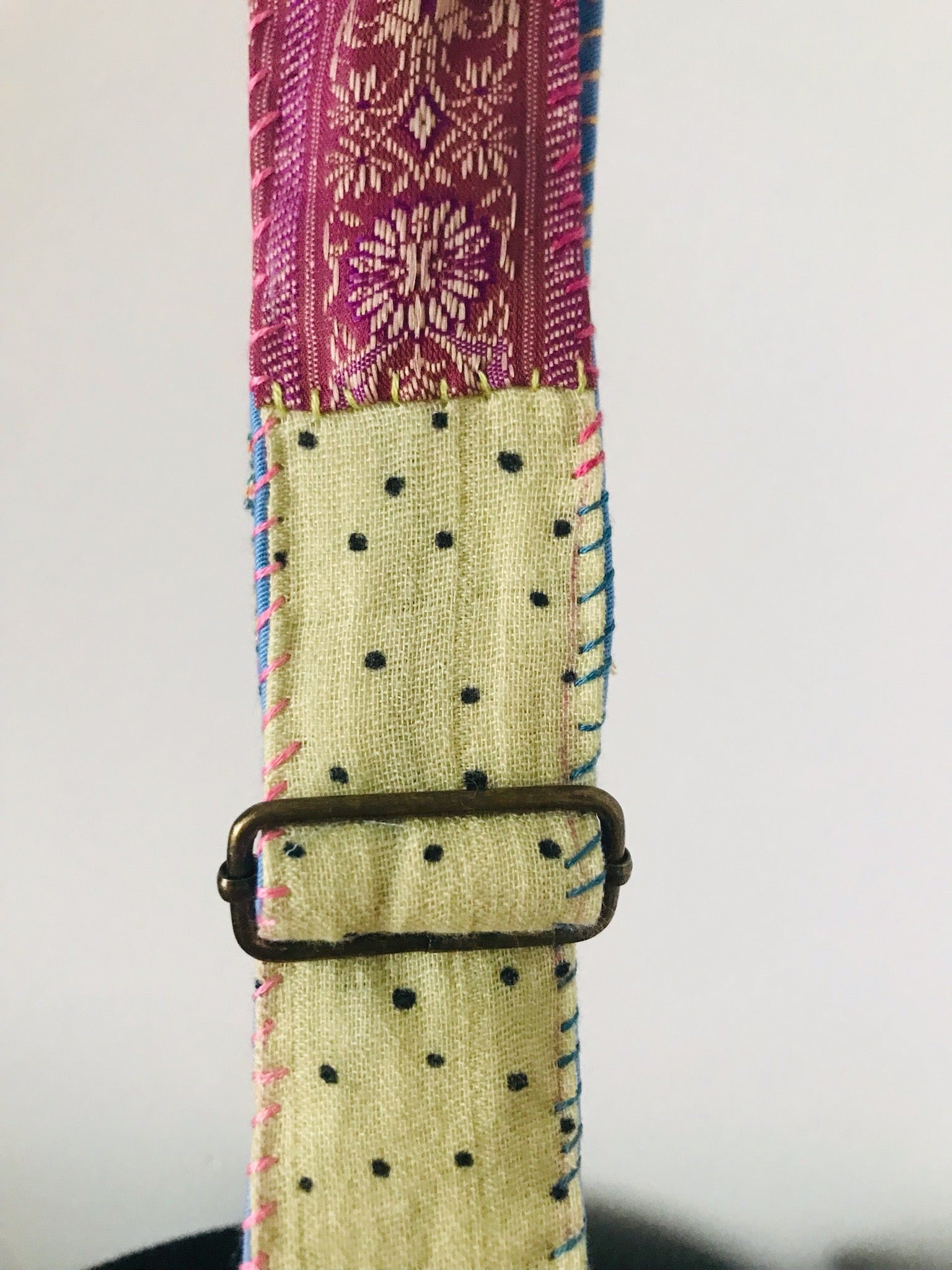 Denne farverige rem er lavet af stofrester og strikket stof, der er syet sammen med metalbeslag i begge ender. Længden er justerbar.