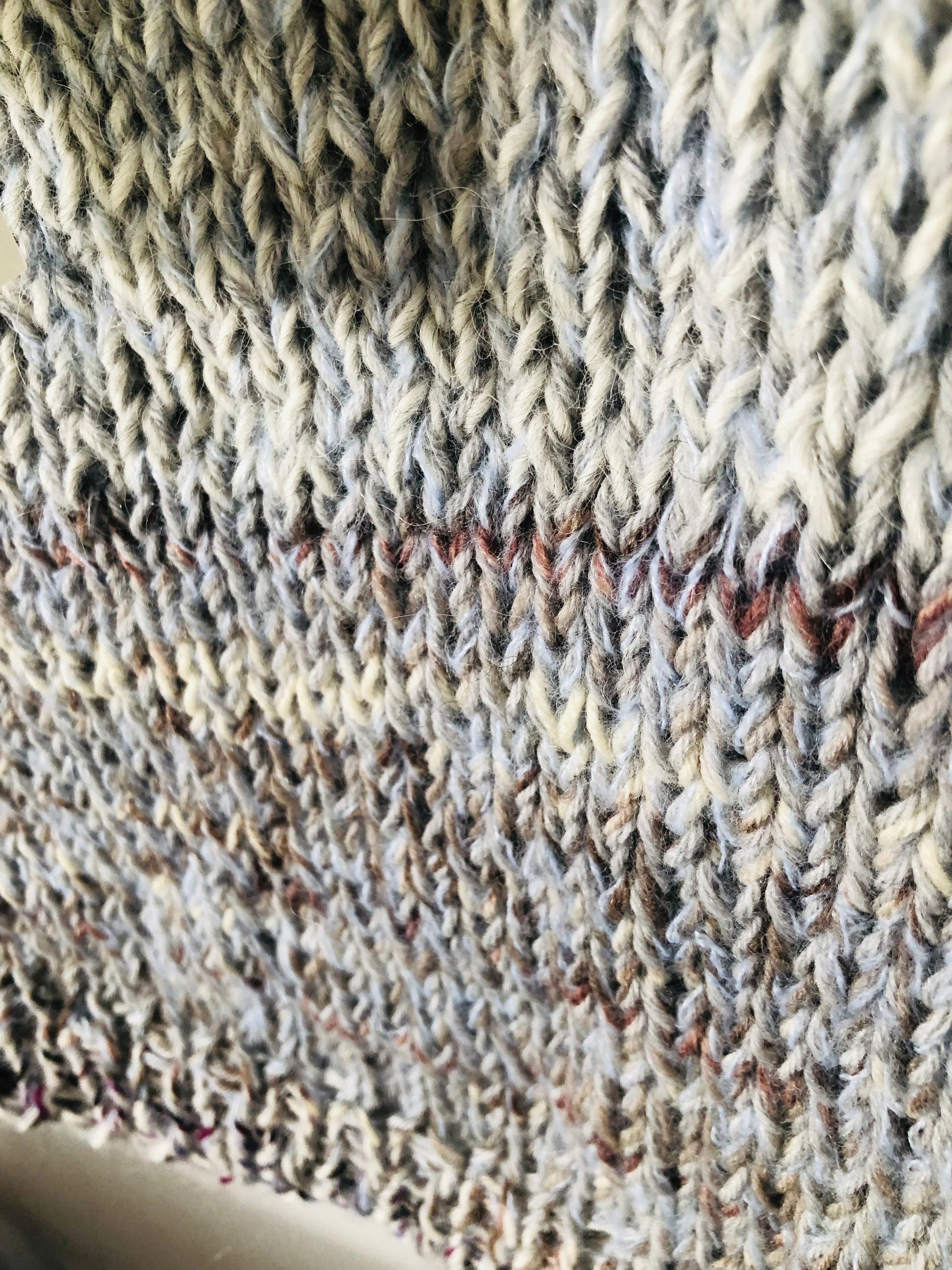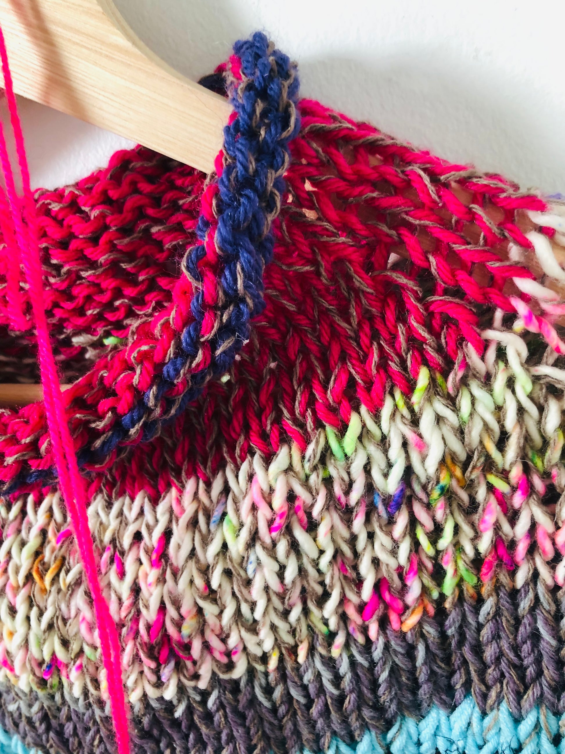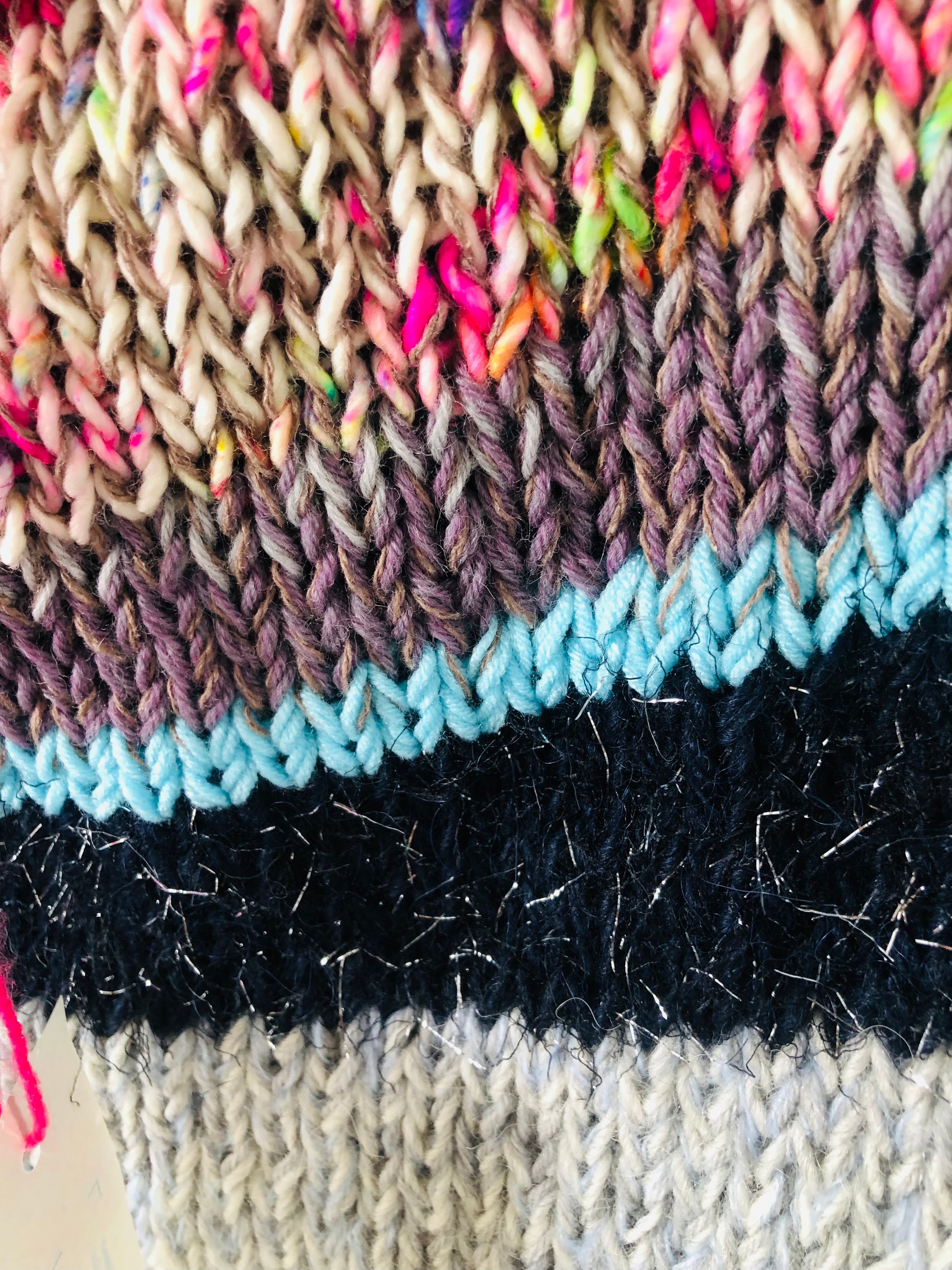 I used a variety of yarns to knit a one-of-a-kind sweater.