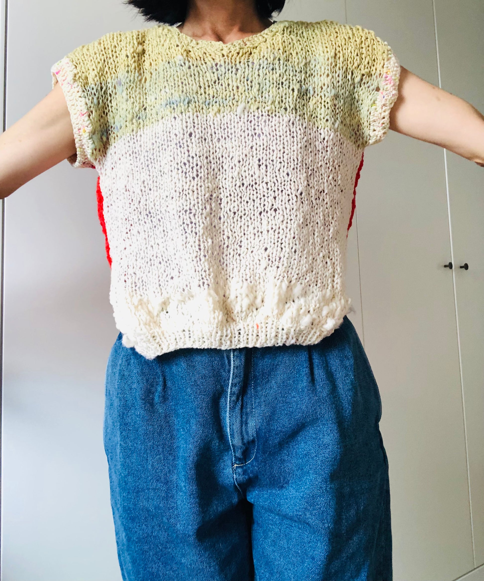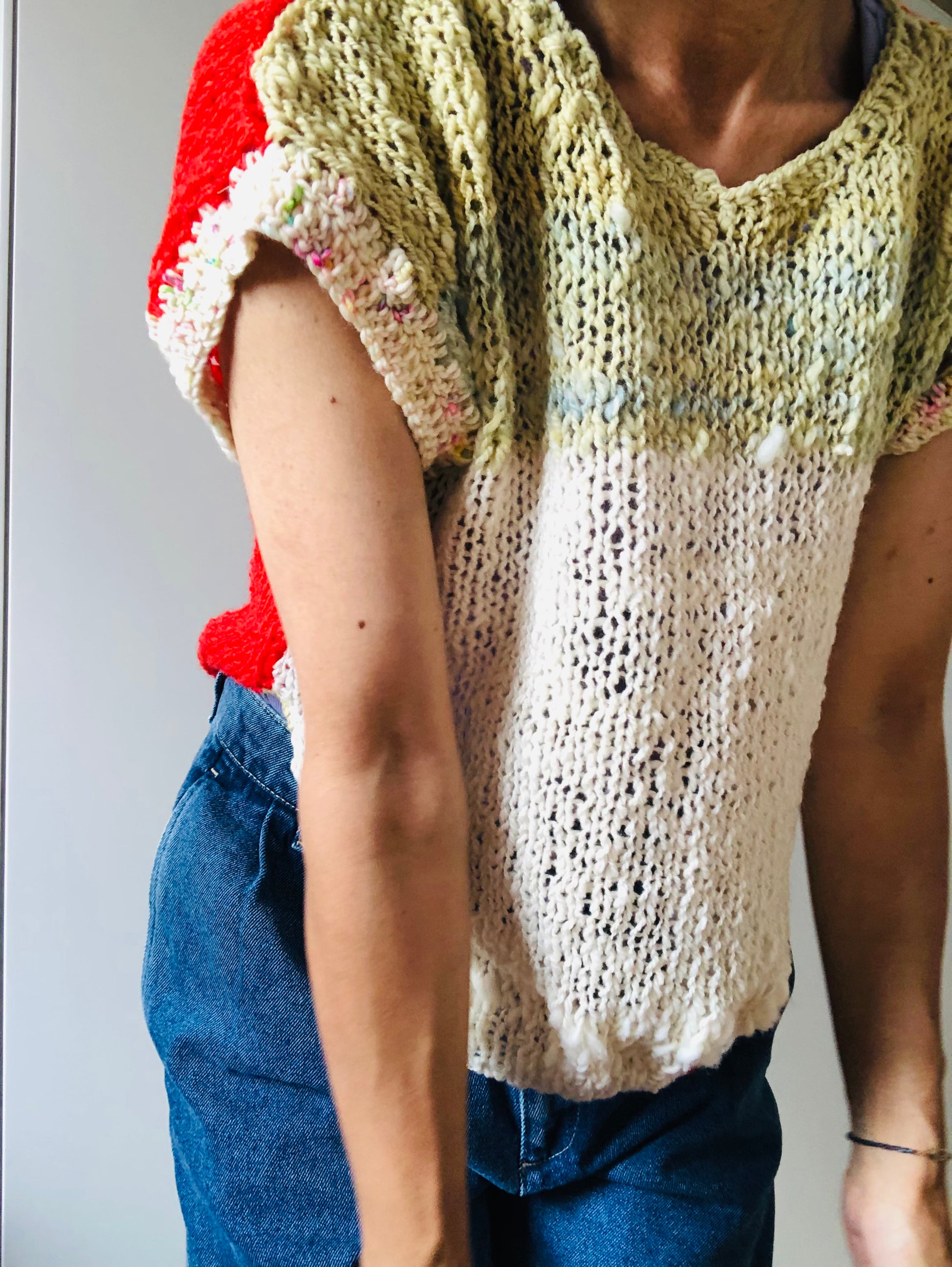 Hand-knitted sweater, slow fashion, fancy yarn, oneofakind, short sleeves, short length, 2256