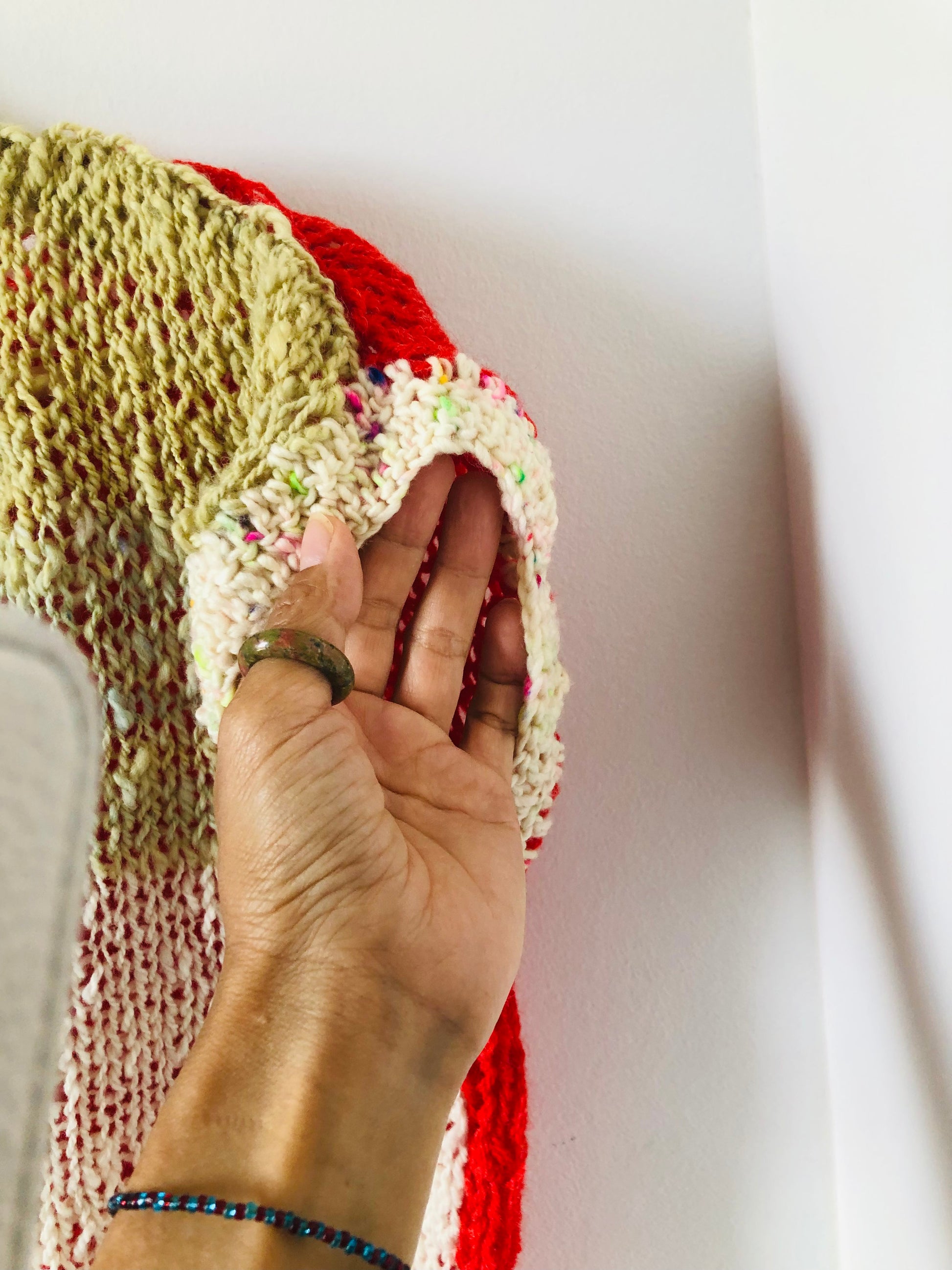 This product is made entirely by hand stitching and hand knitting.