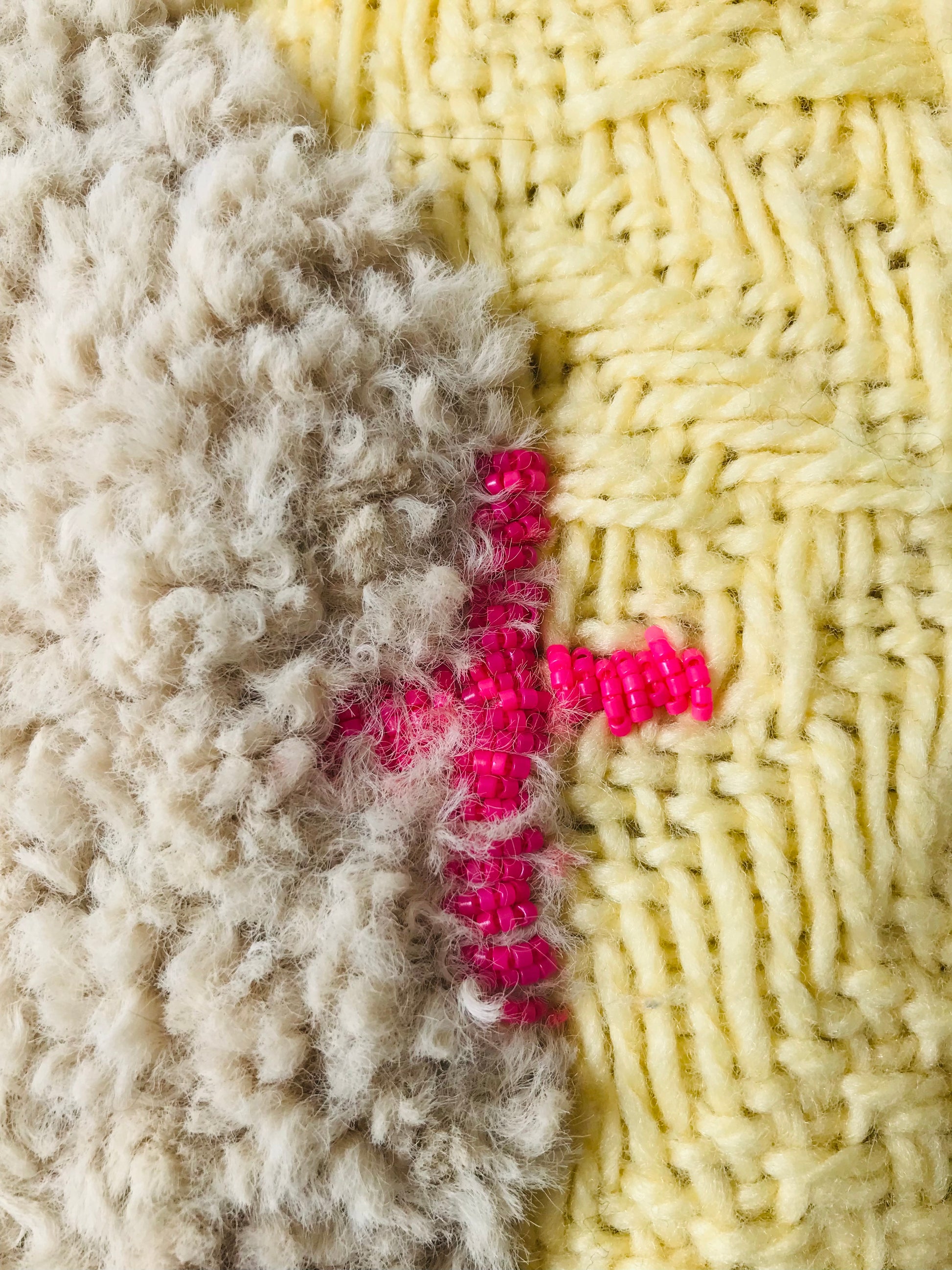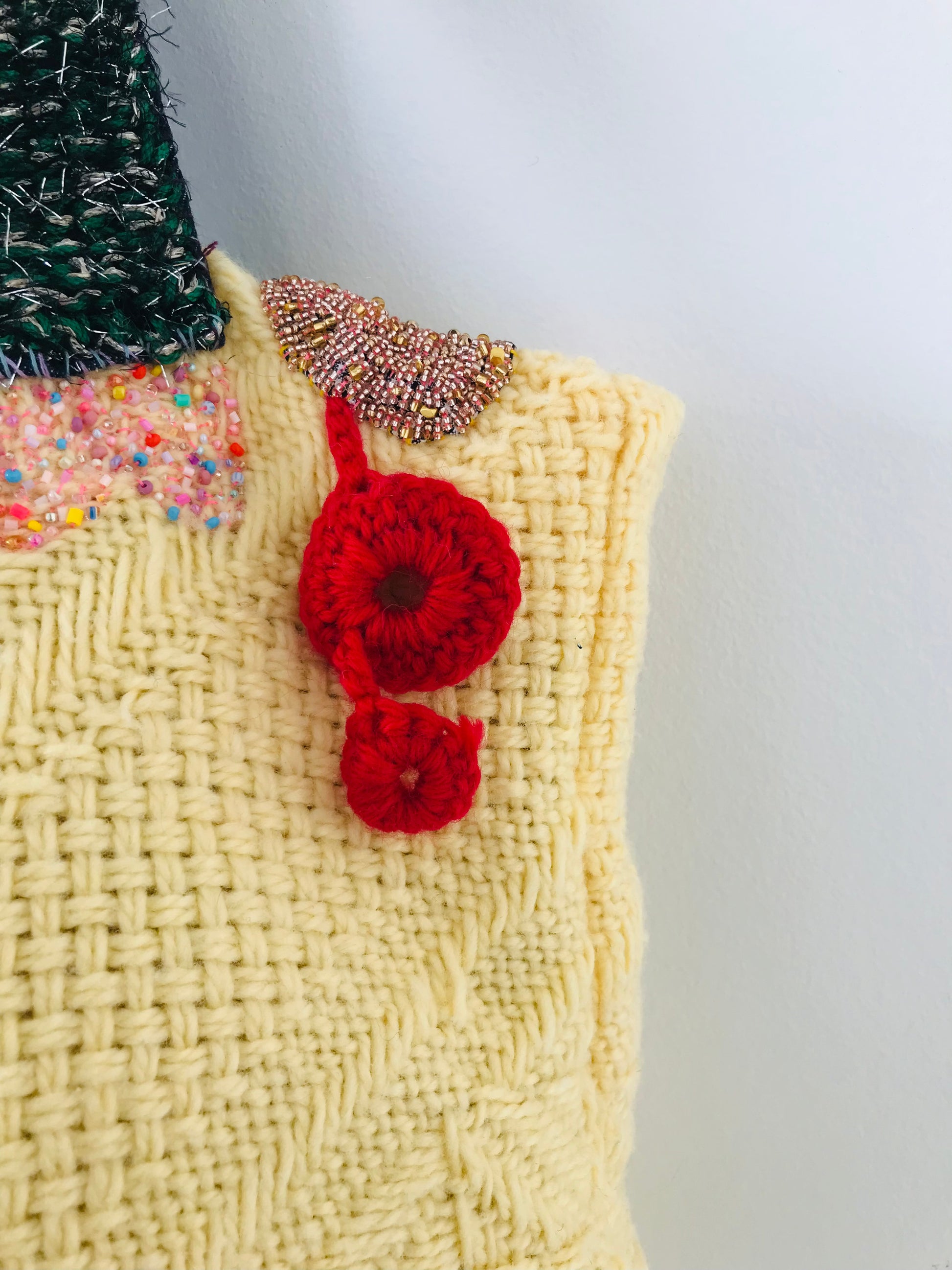The light yellow knit fabric is decorated with fluffy circles and red doilies.