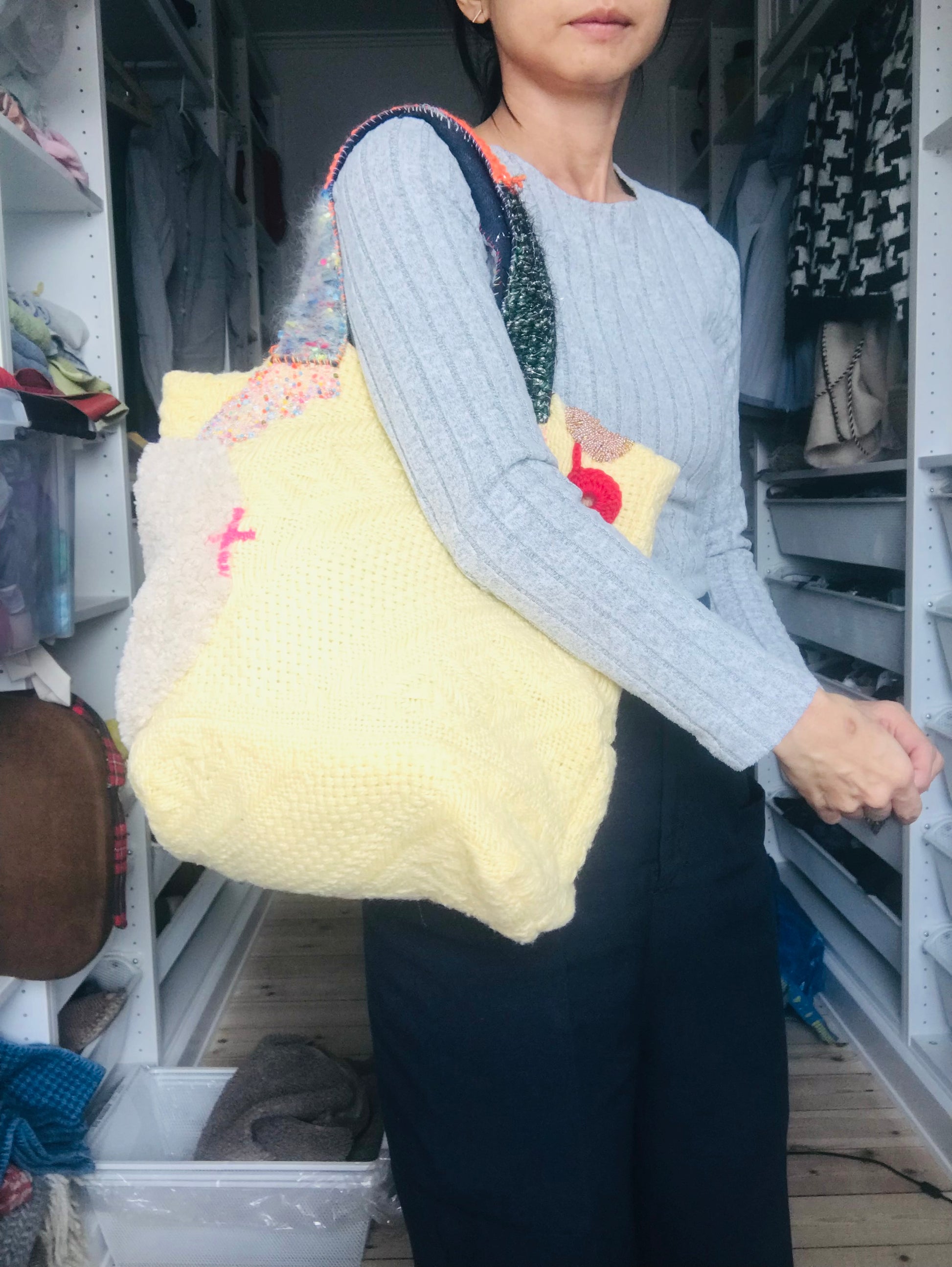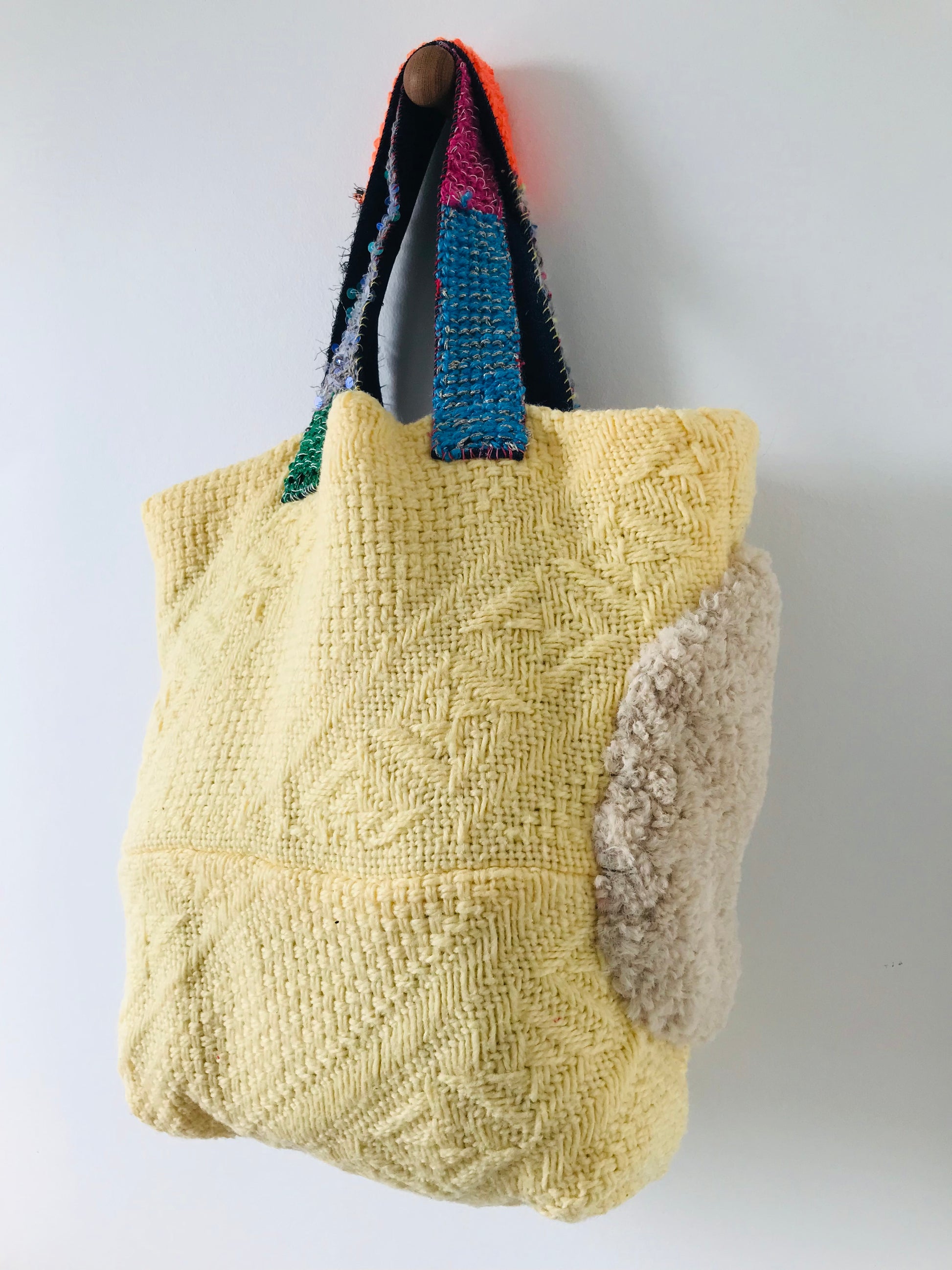The handle is made from Afghan knitting. The back is well reinforced to prevent it from stretching.