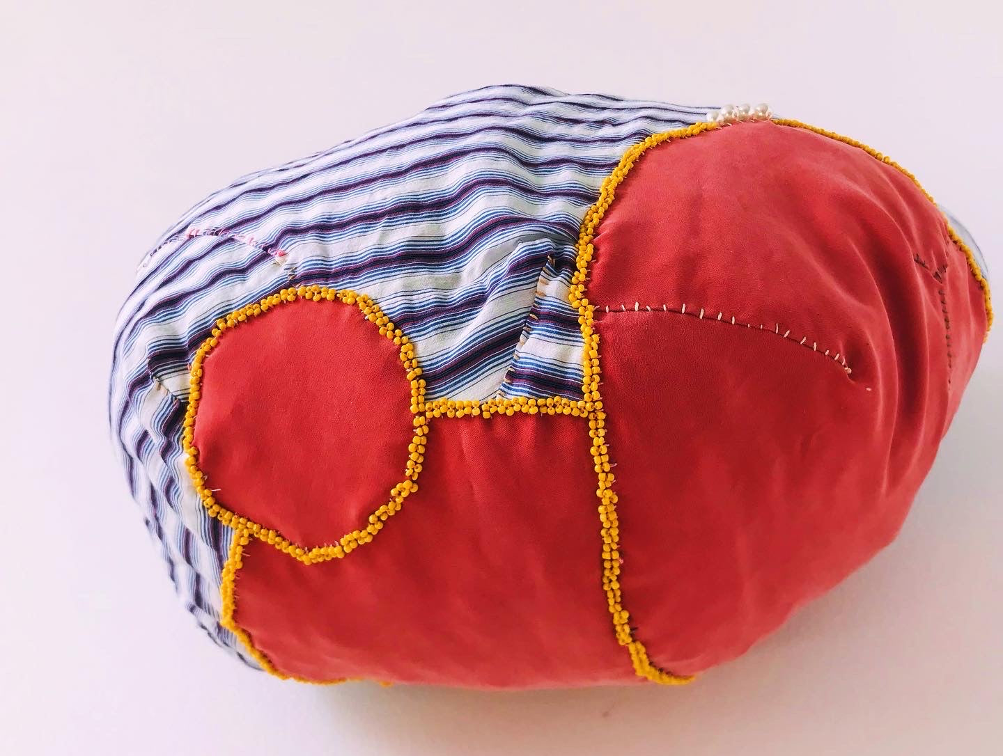 This striped shirt fabric is patchworked with coral colored fabric. The cute yellow trim makes it stand out.