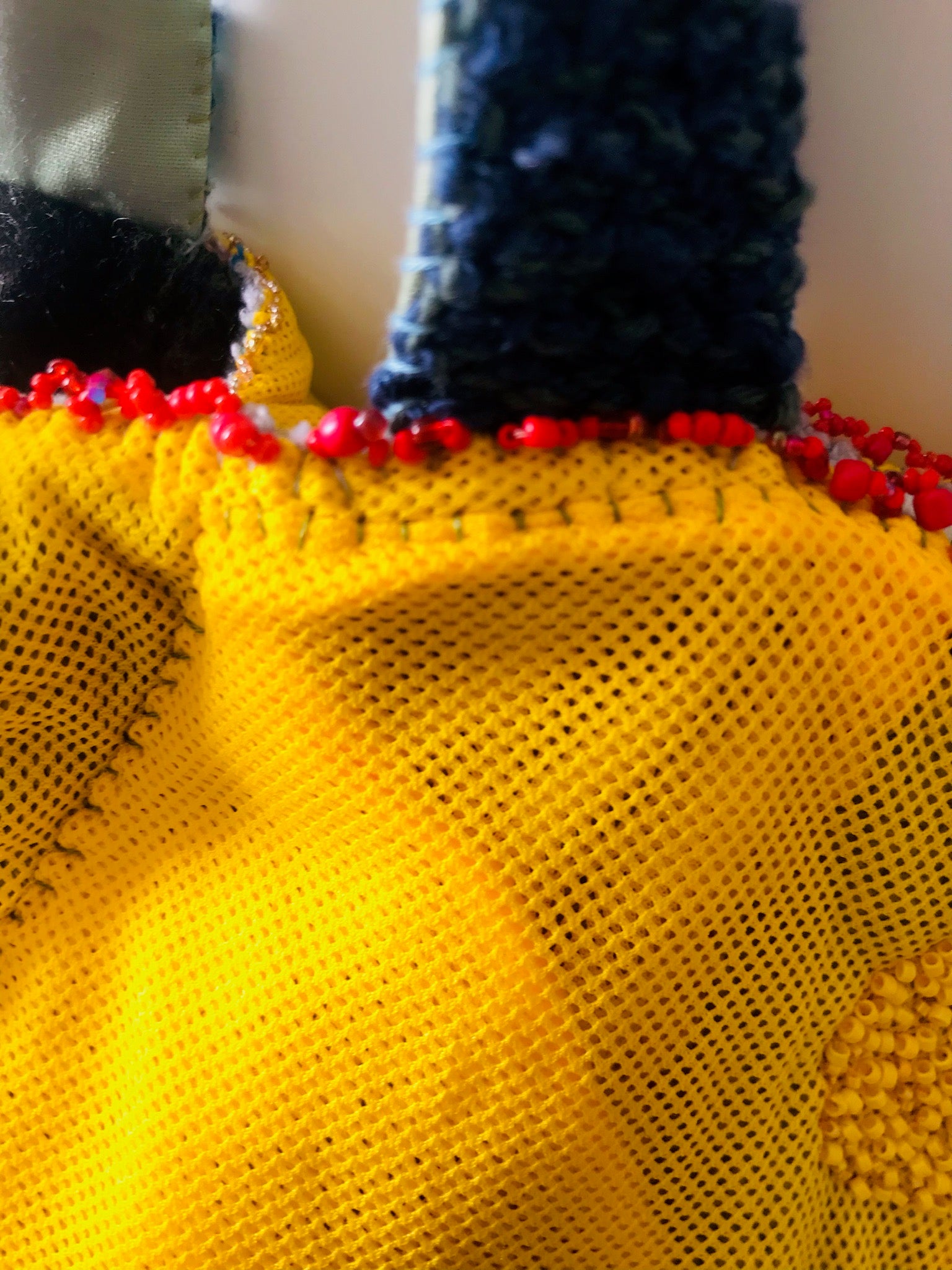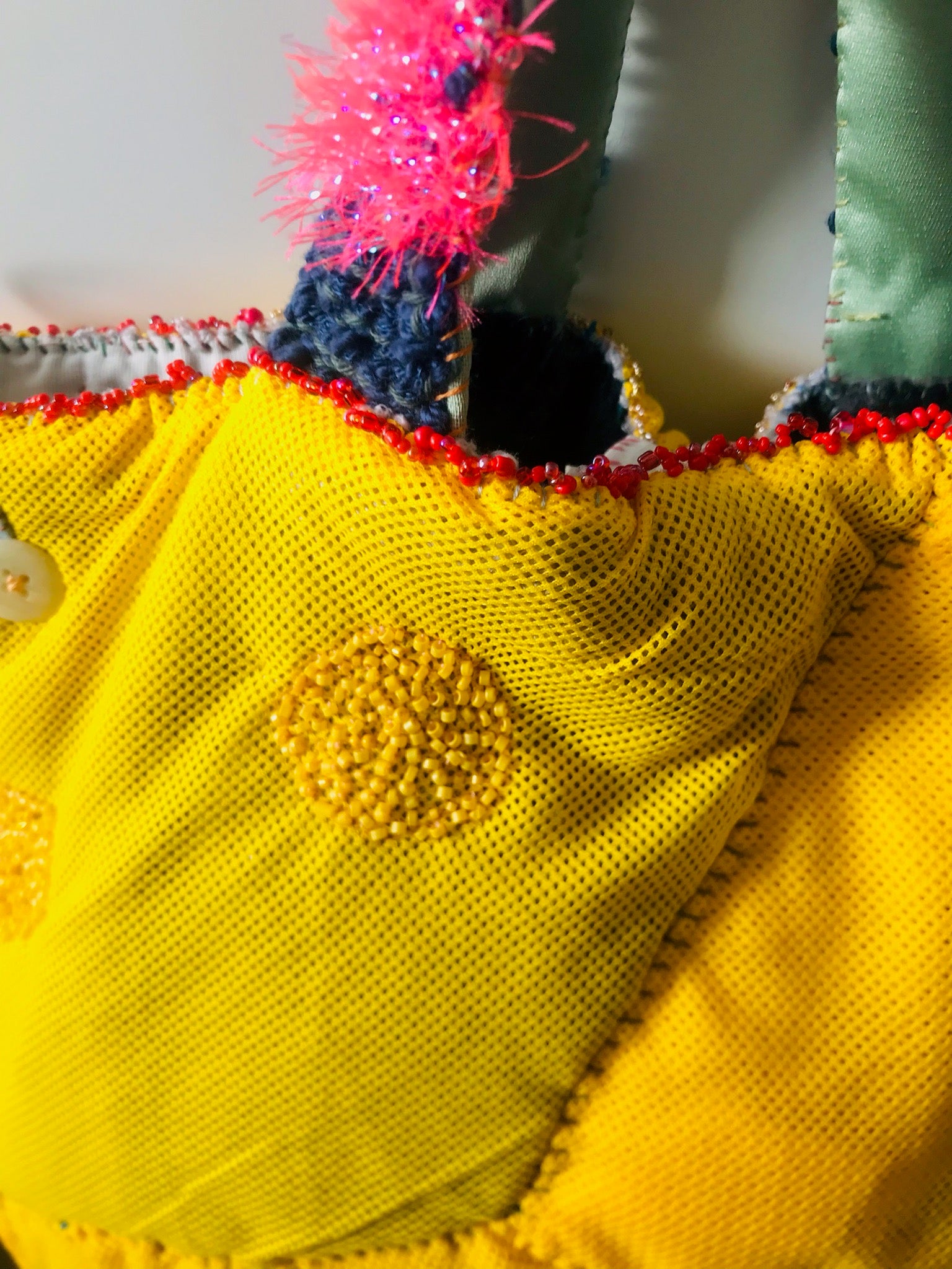 Made of fabric. Hand sewn.
