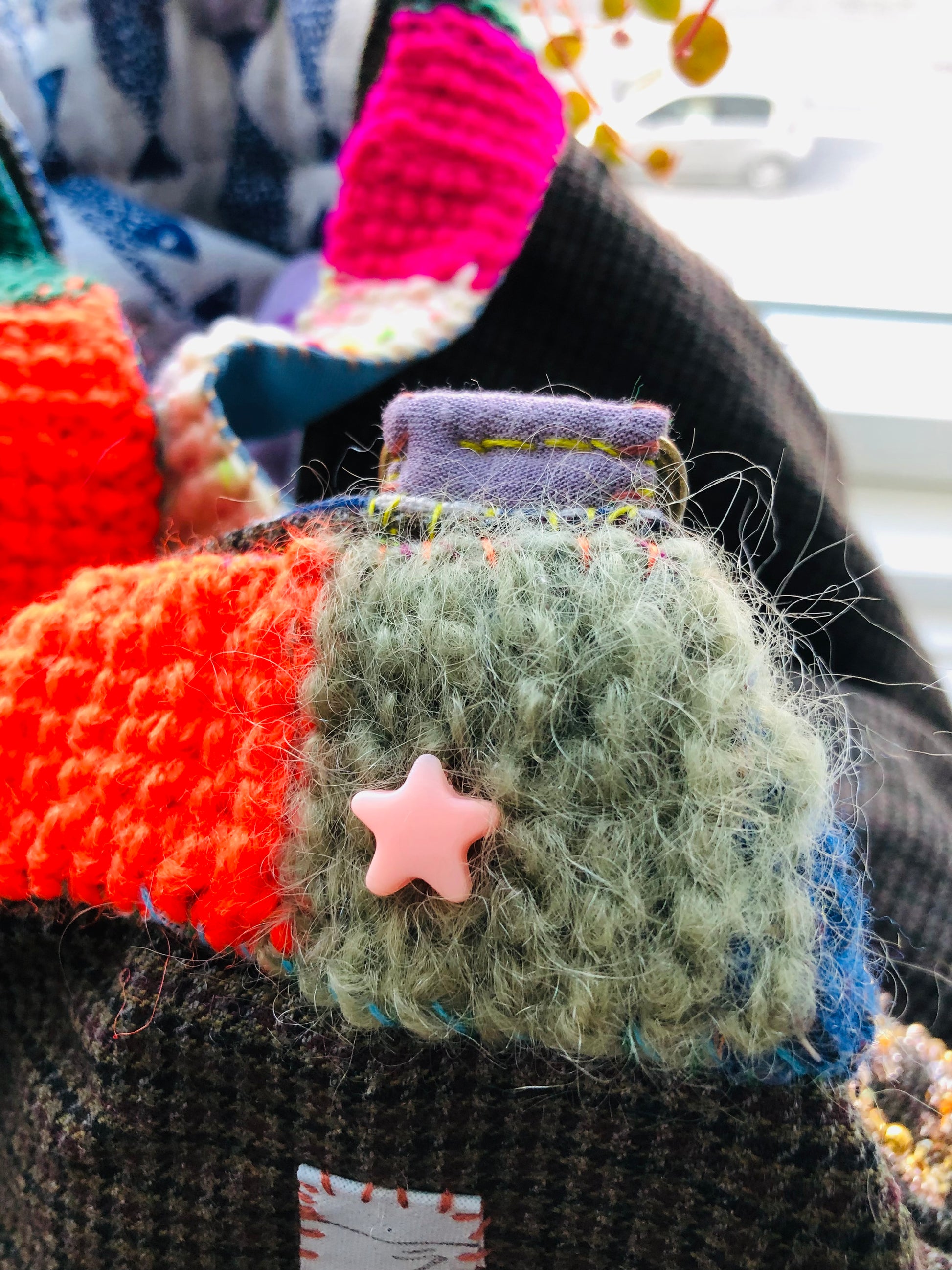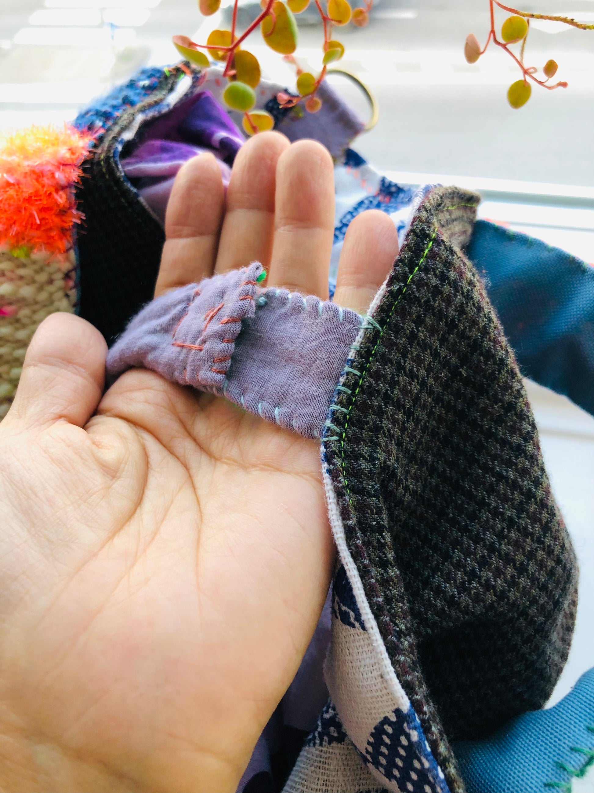 Made of fabric. Hand sewn.