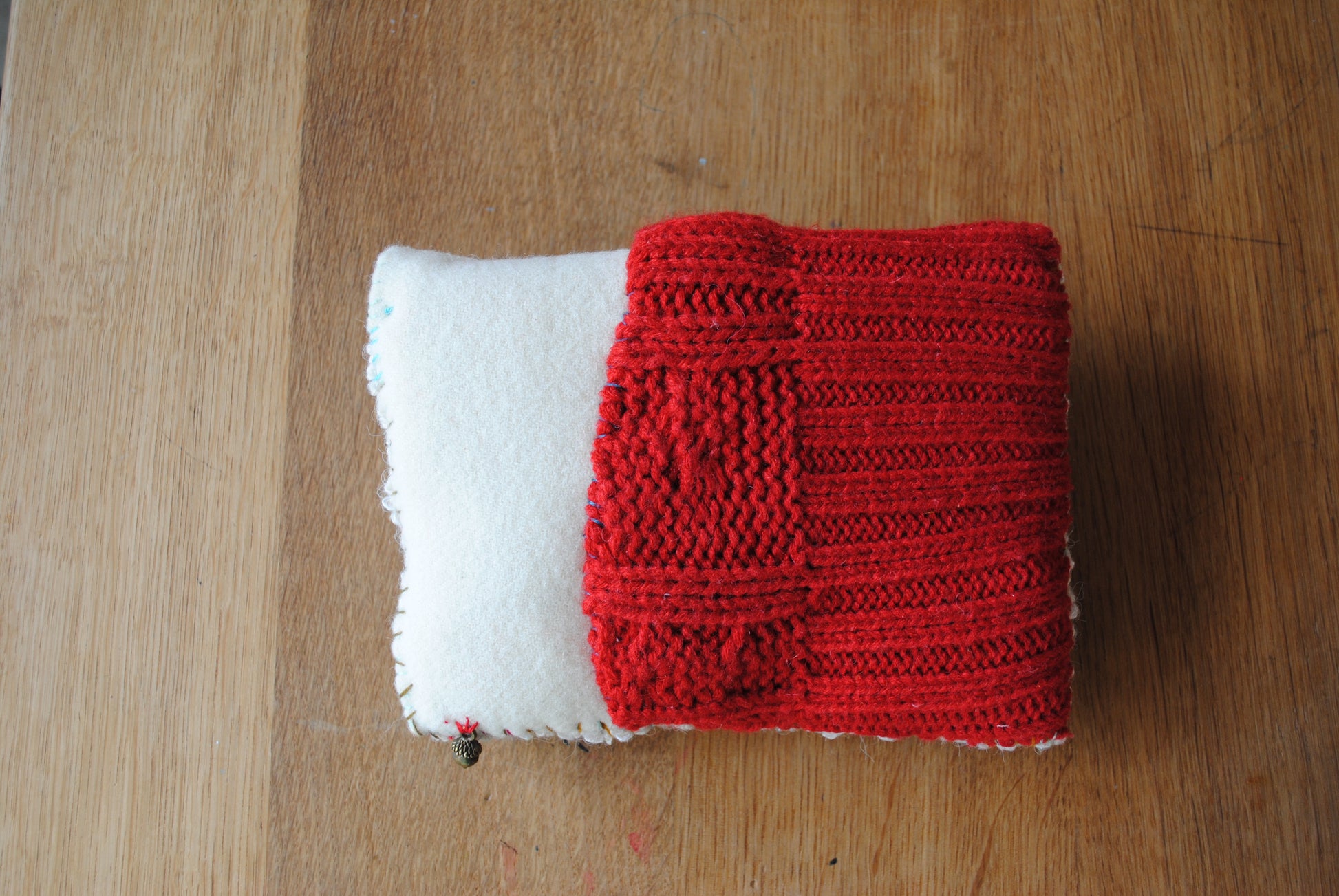 Red and slightly light mint green are combined with a woolen fabric with antique lace.