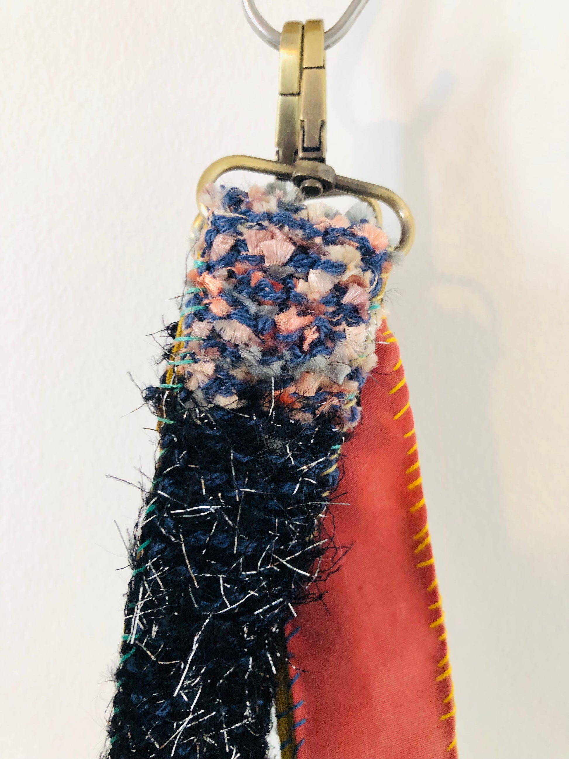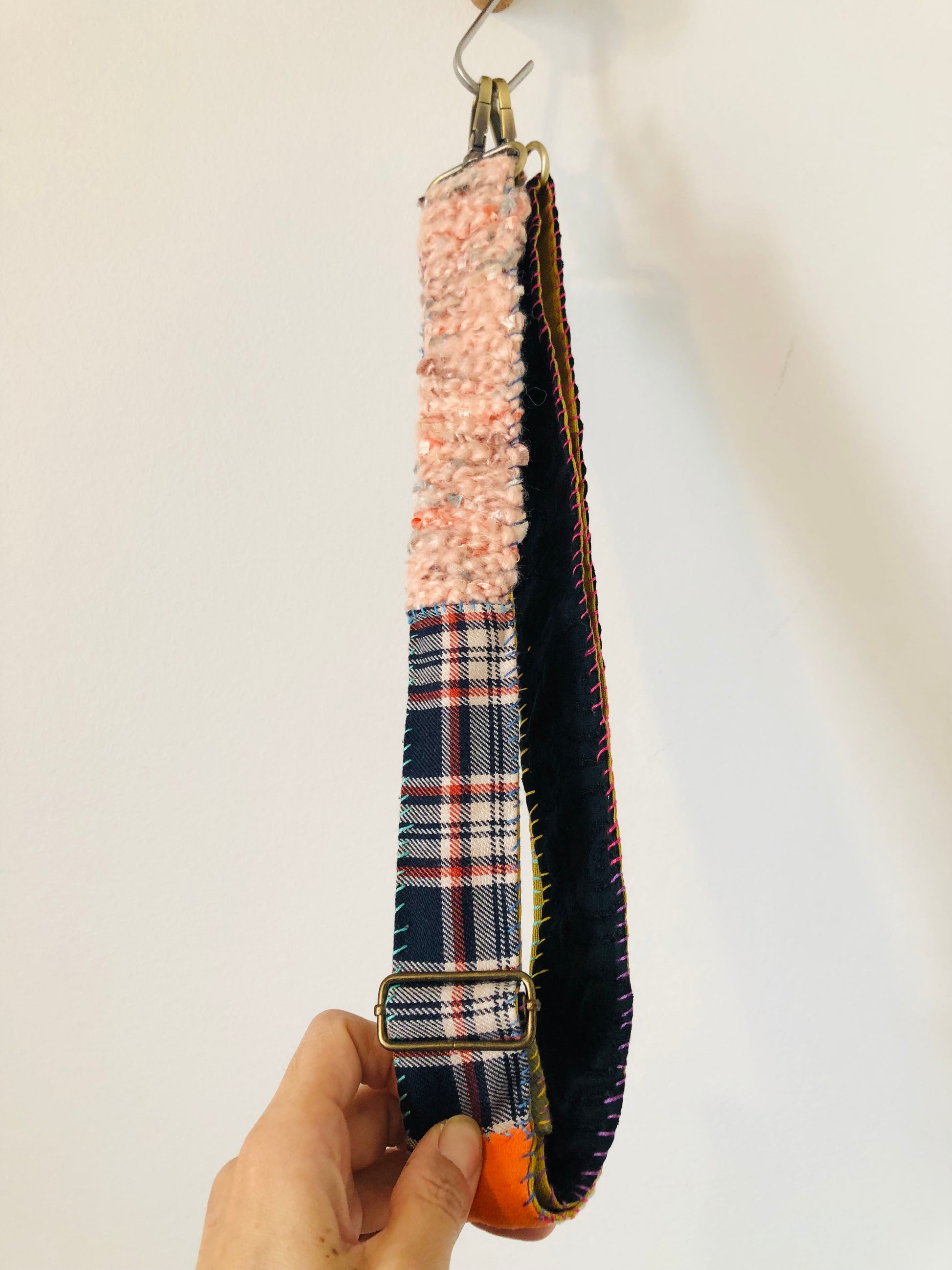 A colorful strap made from scraps of fabric and knitted fabric sewn together with metal fittings on both ends. The length is adjustable.
