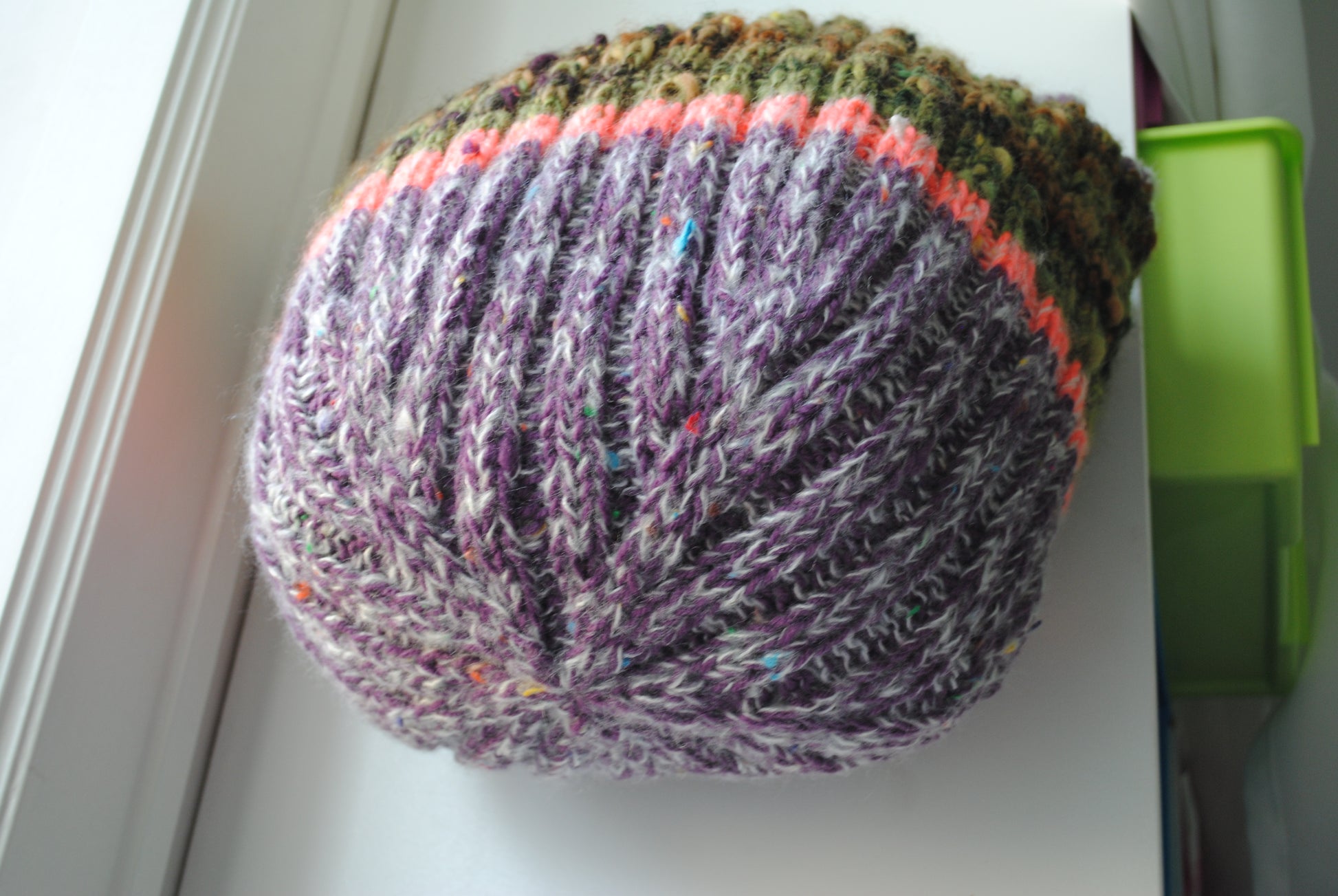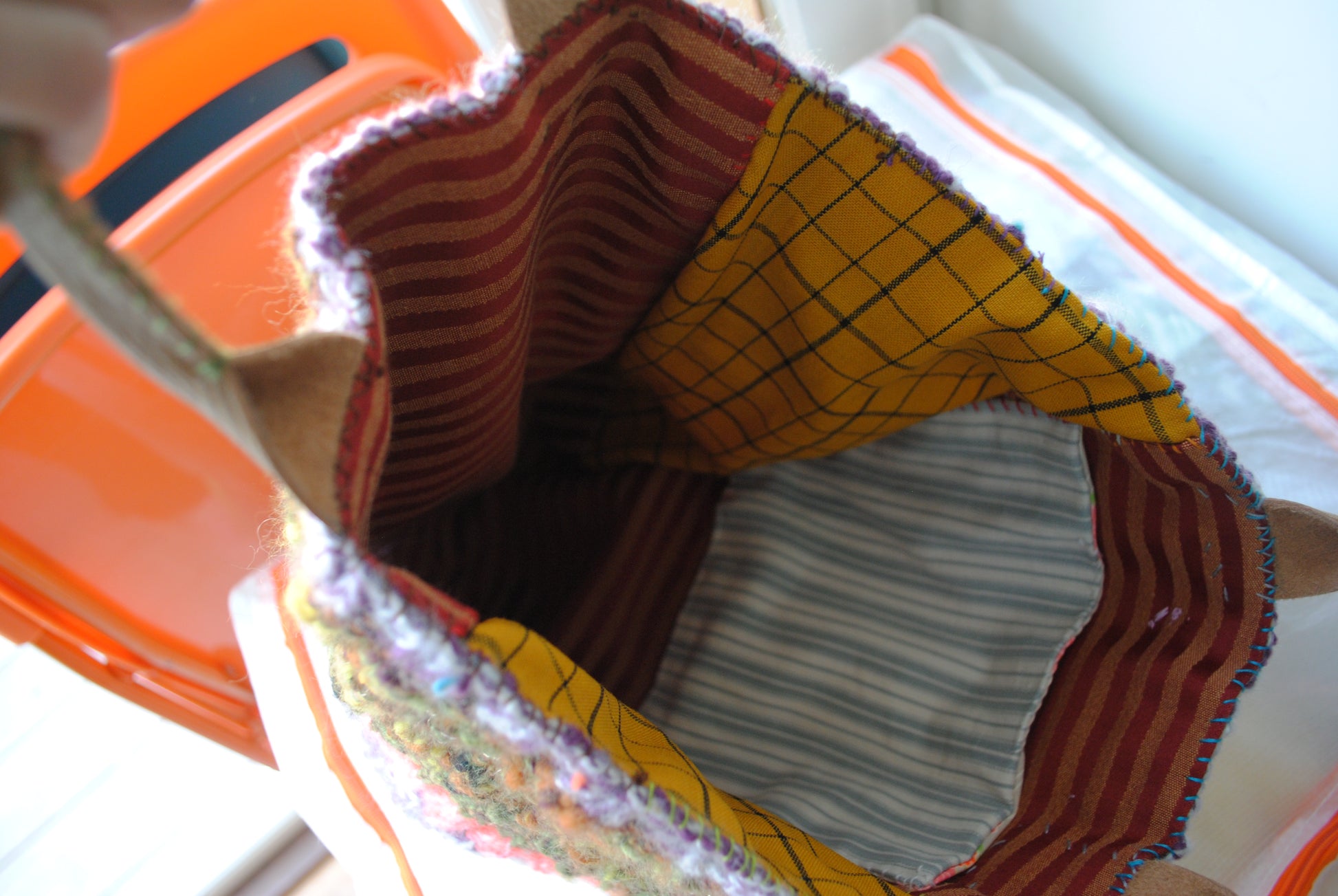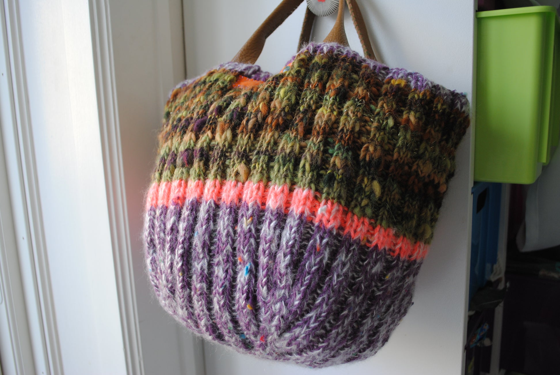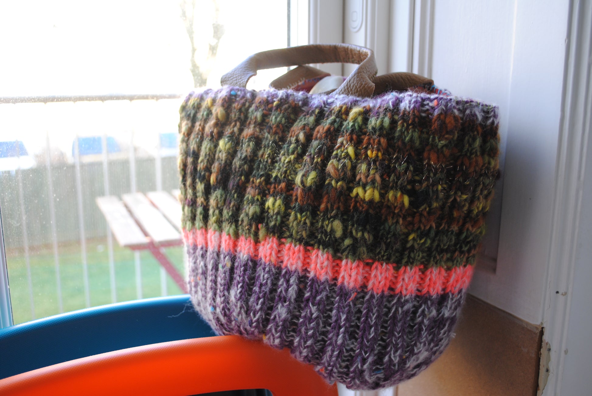 大き目のニット帽を編むように、ふわふわのニットバッグを編みました。