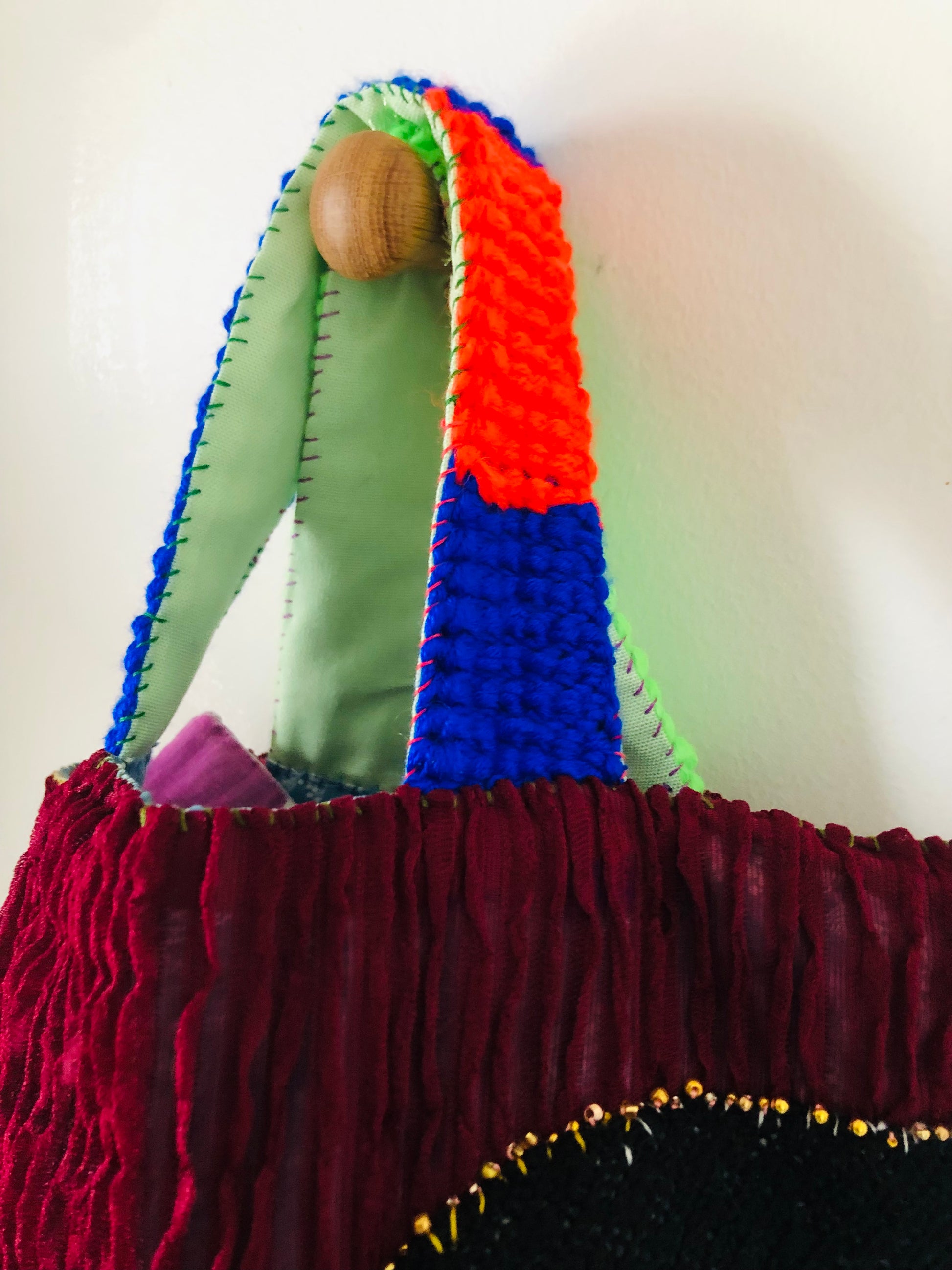 ⭕️持ち手は色々な糸でアフガン編みしました。補強してあるので伸びません。