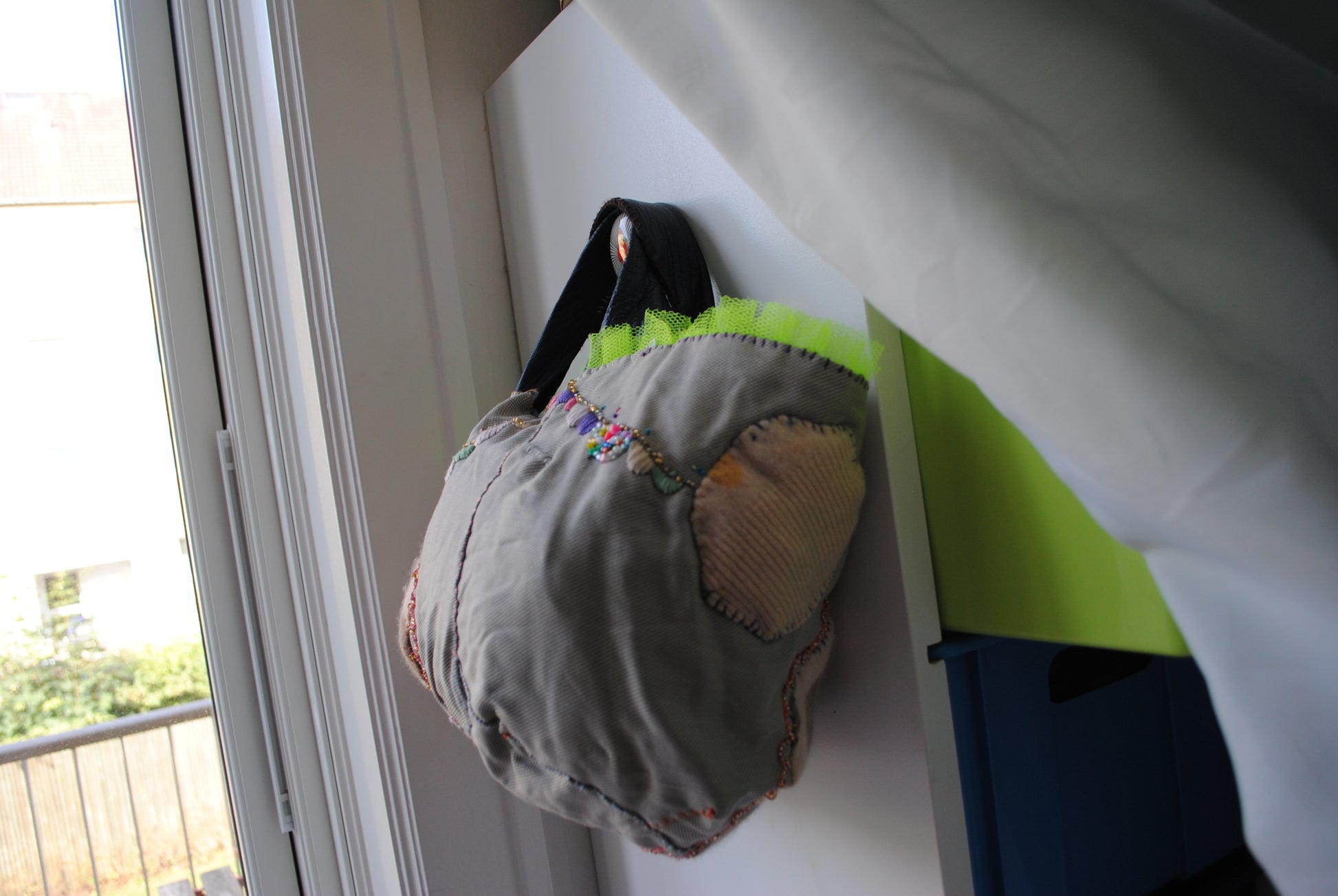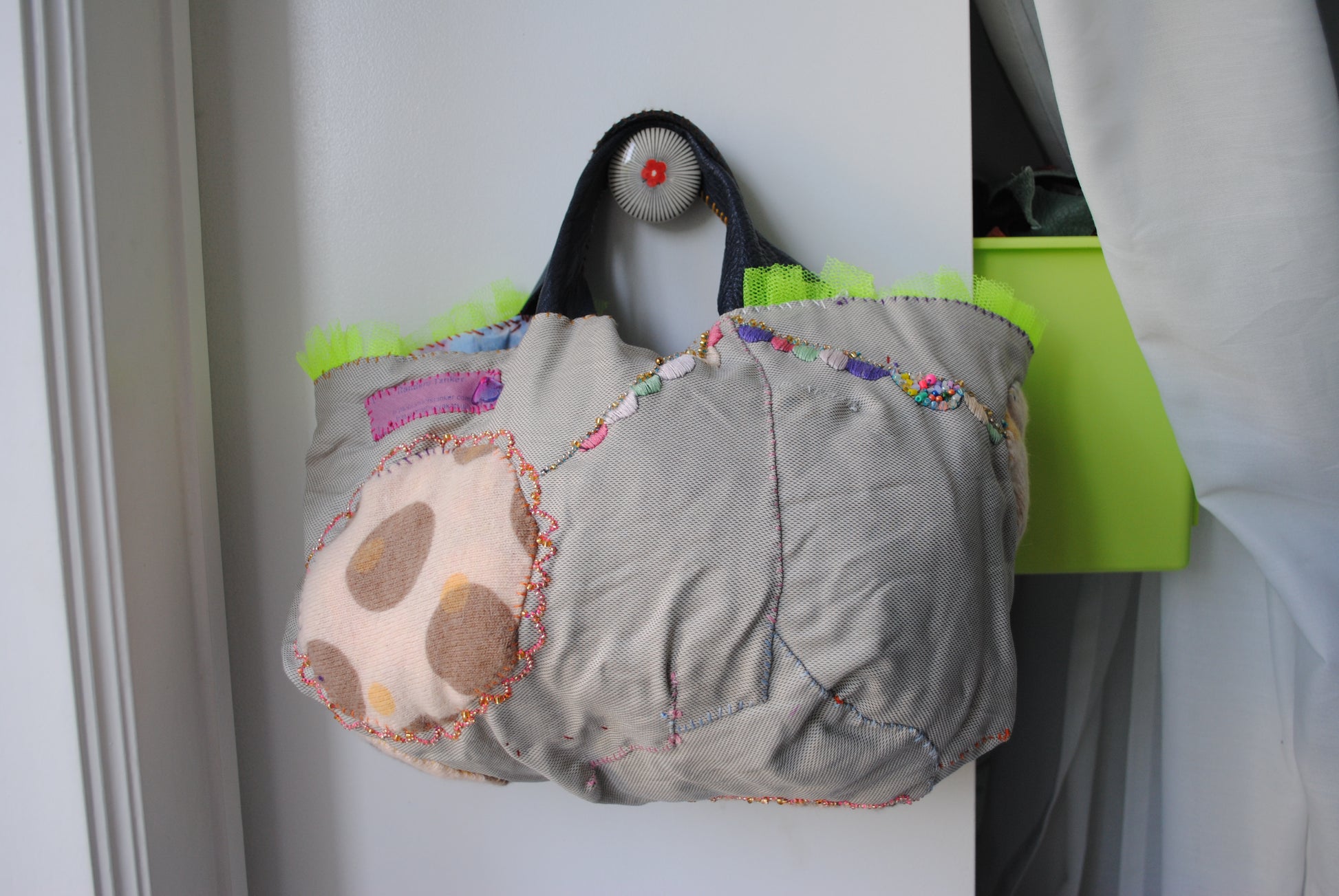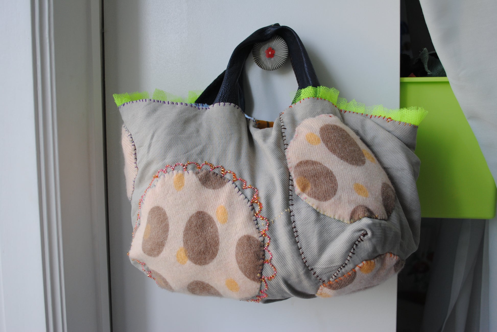 リメイクバージョン。淡い色内のバッグにふわふわニットのパッチワーク、そこをつなげるようにがーらんとを飾りました。