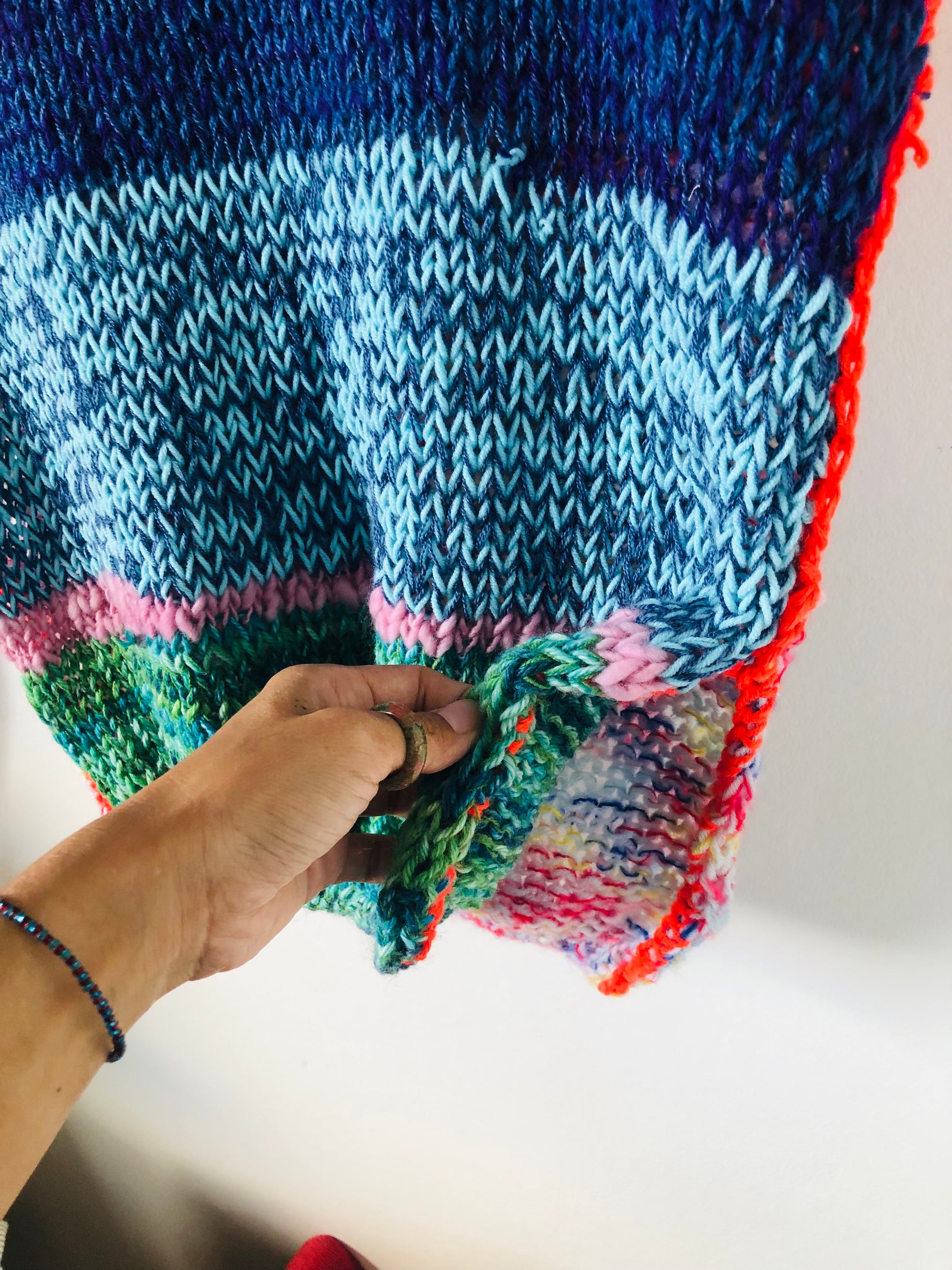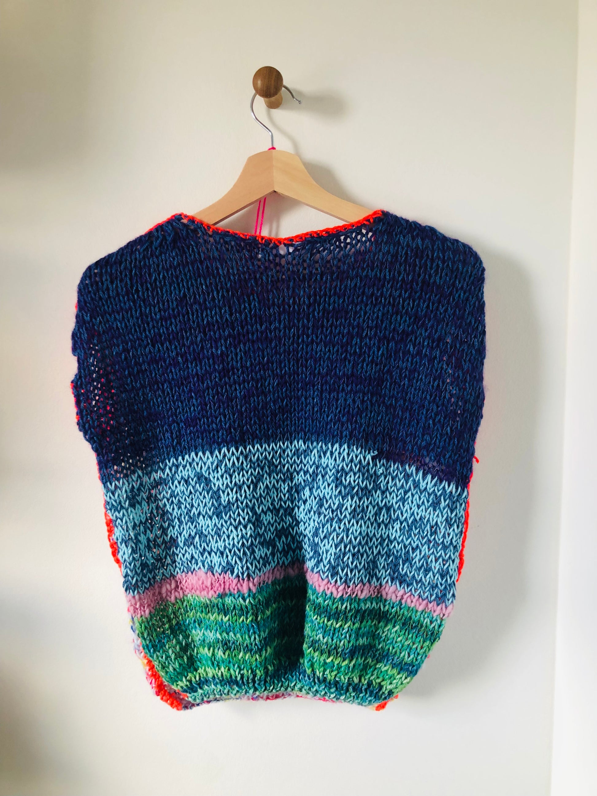I used a variety of yarns to knit a one-of-a-kind sweater.
