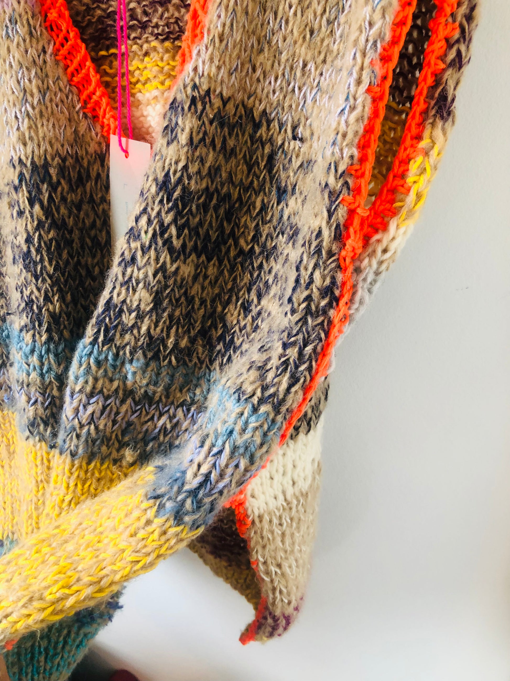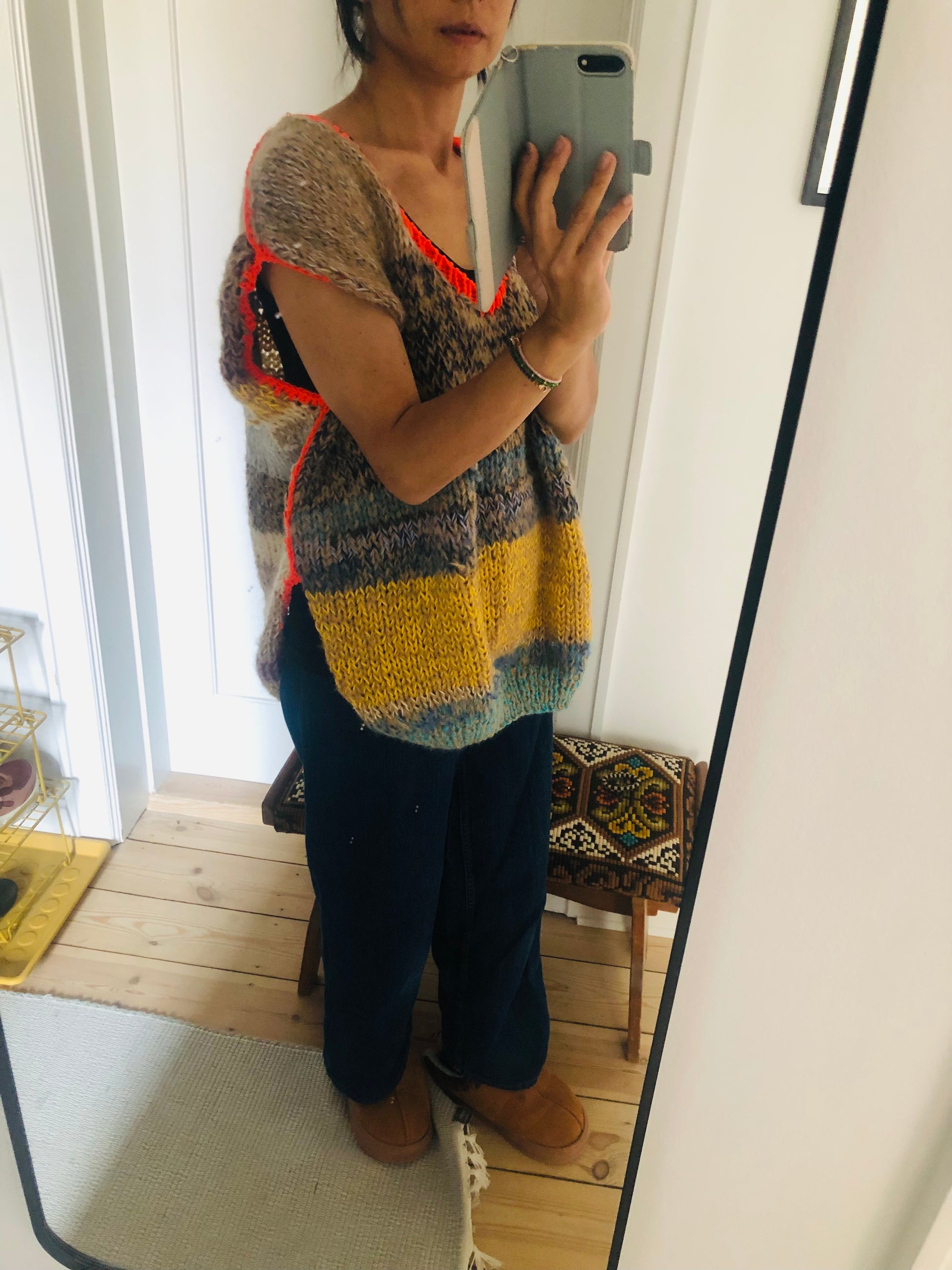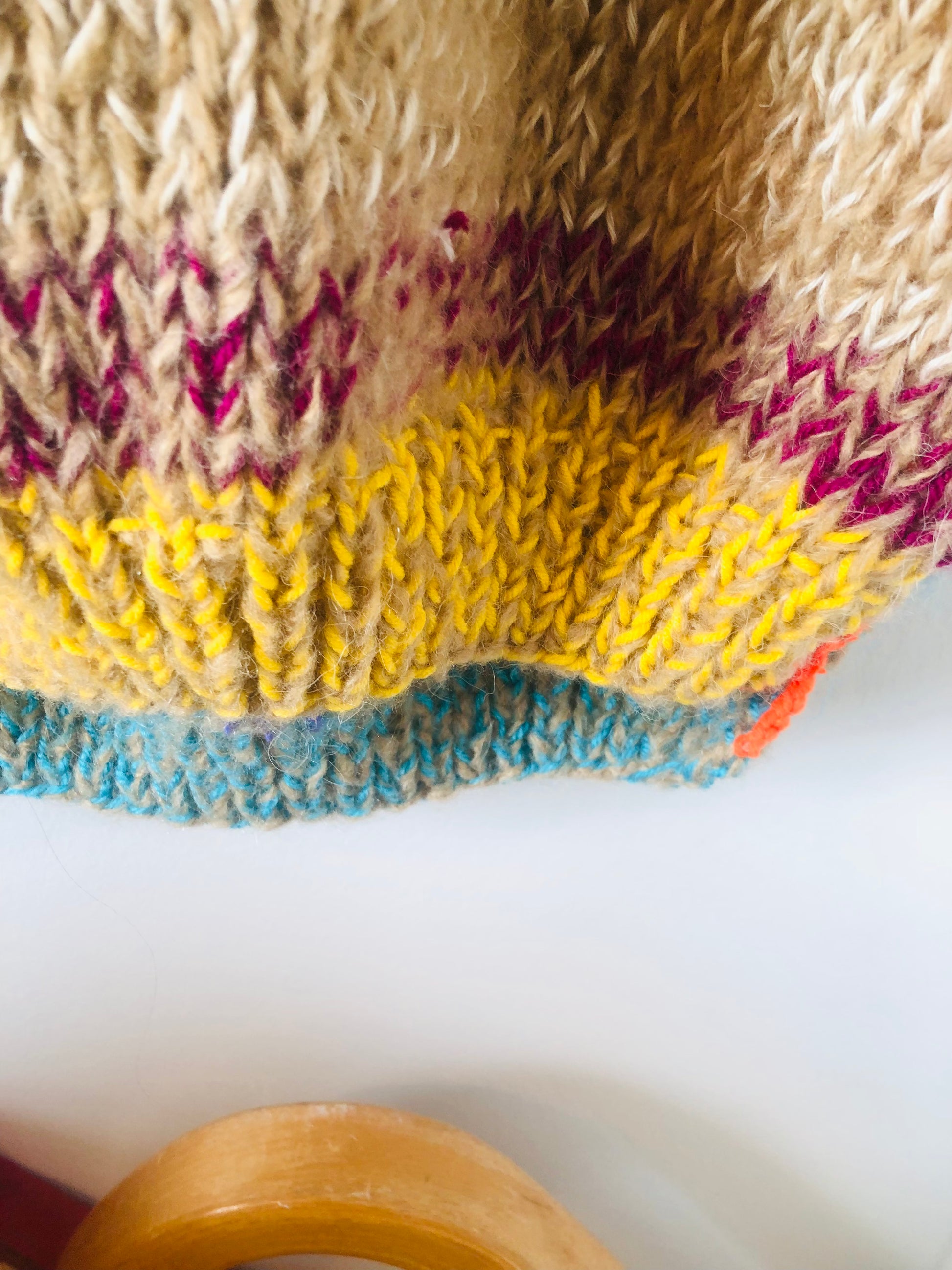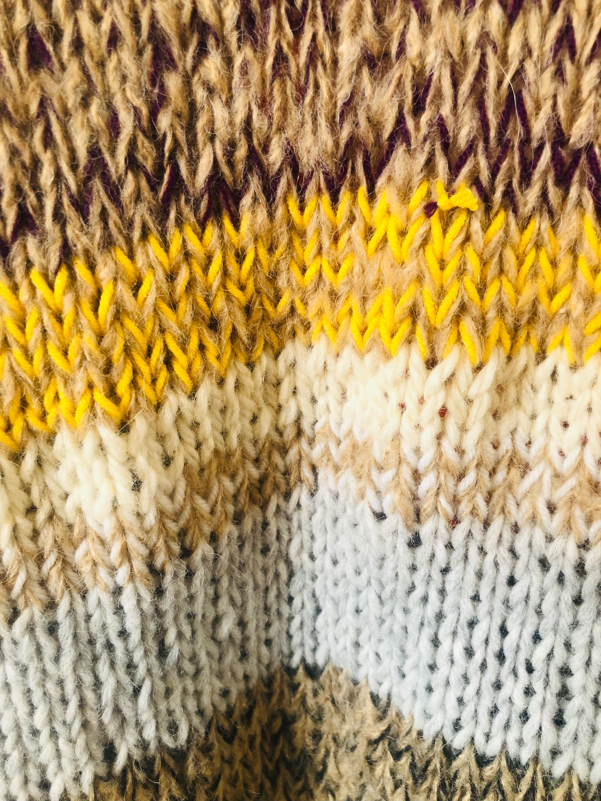 I used a variety of yarns to knit a one-of-a-kind sweater.