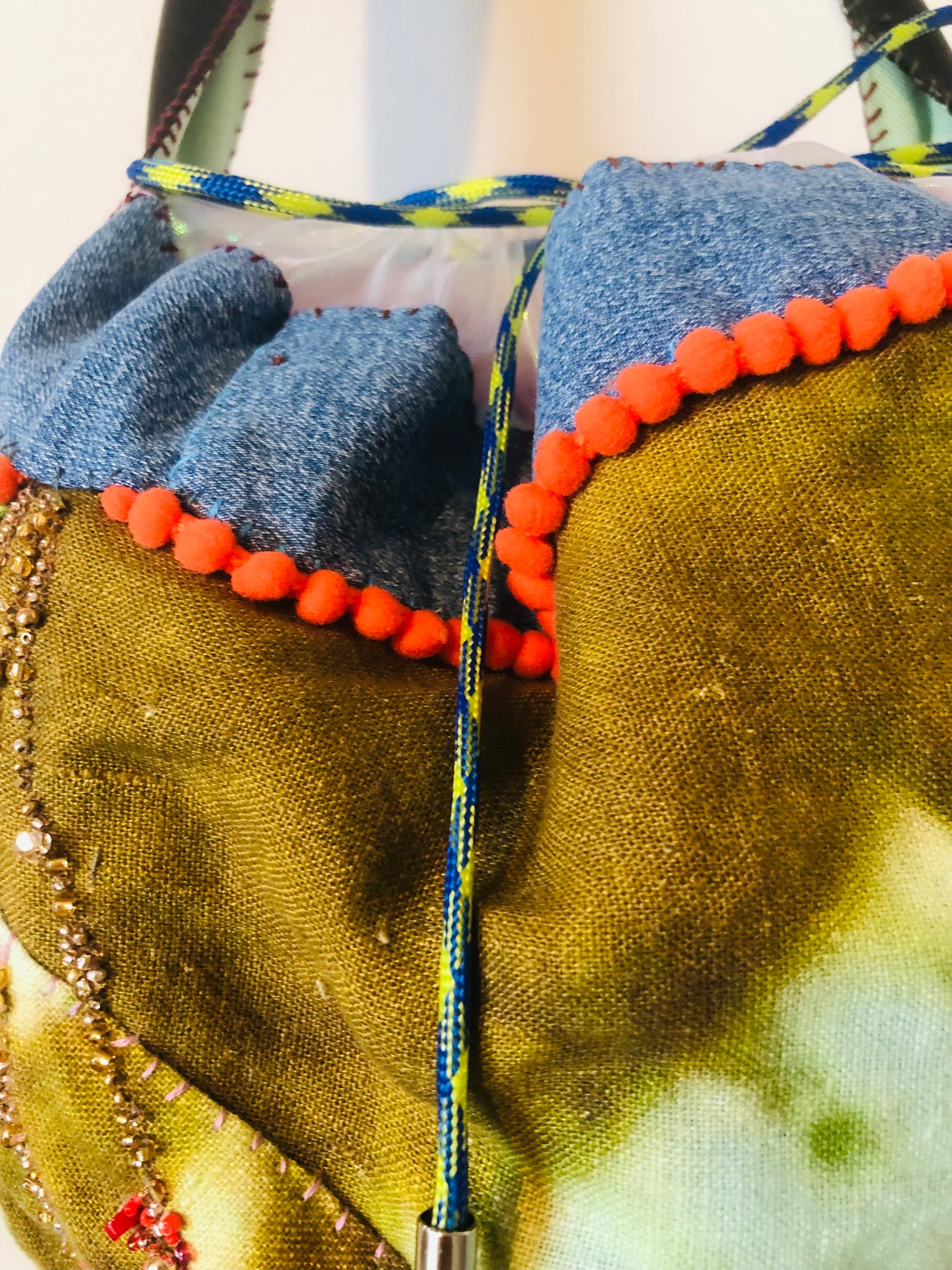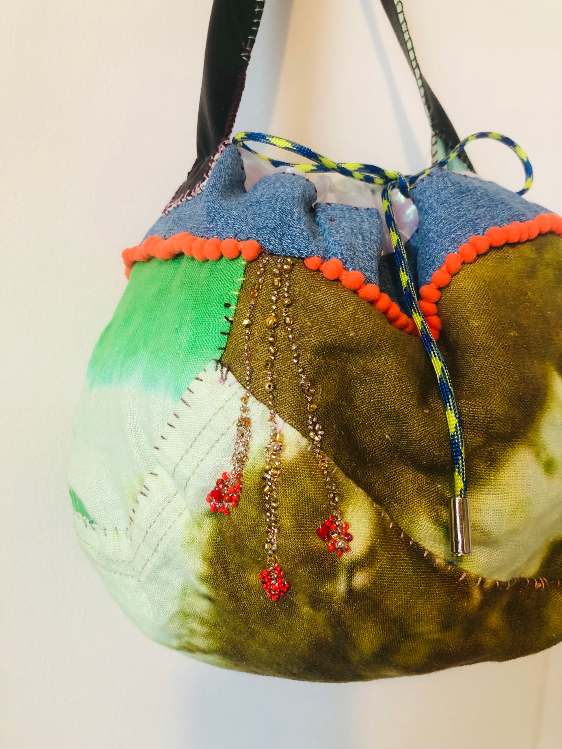 Hand-sewn fabric drawstring bag, slow fashion, handmade, 2313