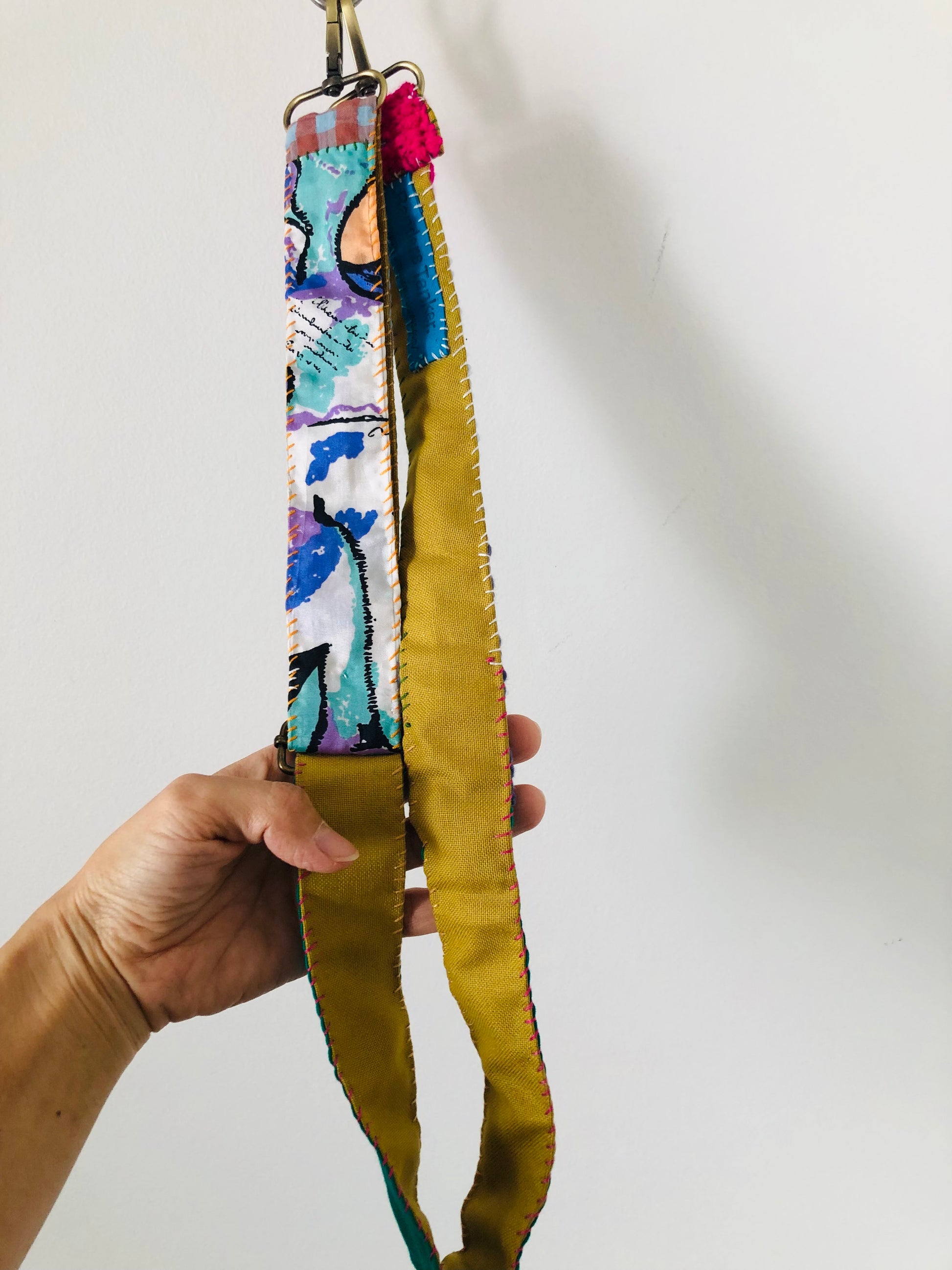 A colorful strap made from scraps of fabric and knitted fabric sewn together with metal fittings on both ends. The length is adjustable.