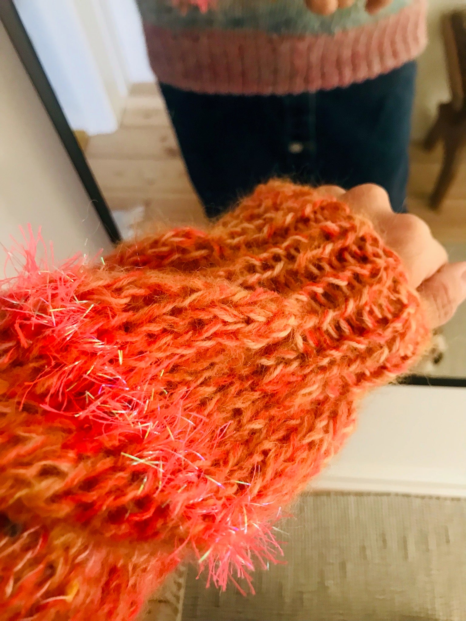 手紡ぎ糸混です❤️ポコポコと変化があって楽しいセーター。ショート丈です。写真参照。