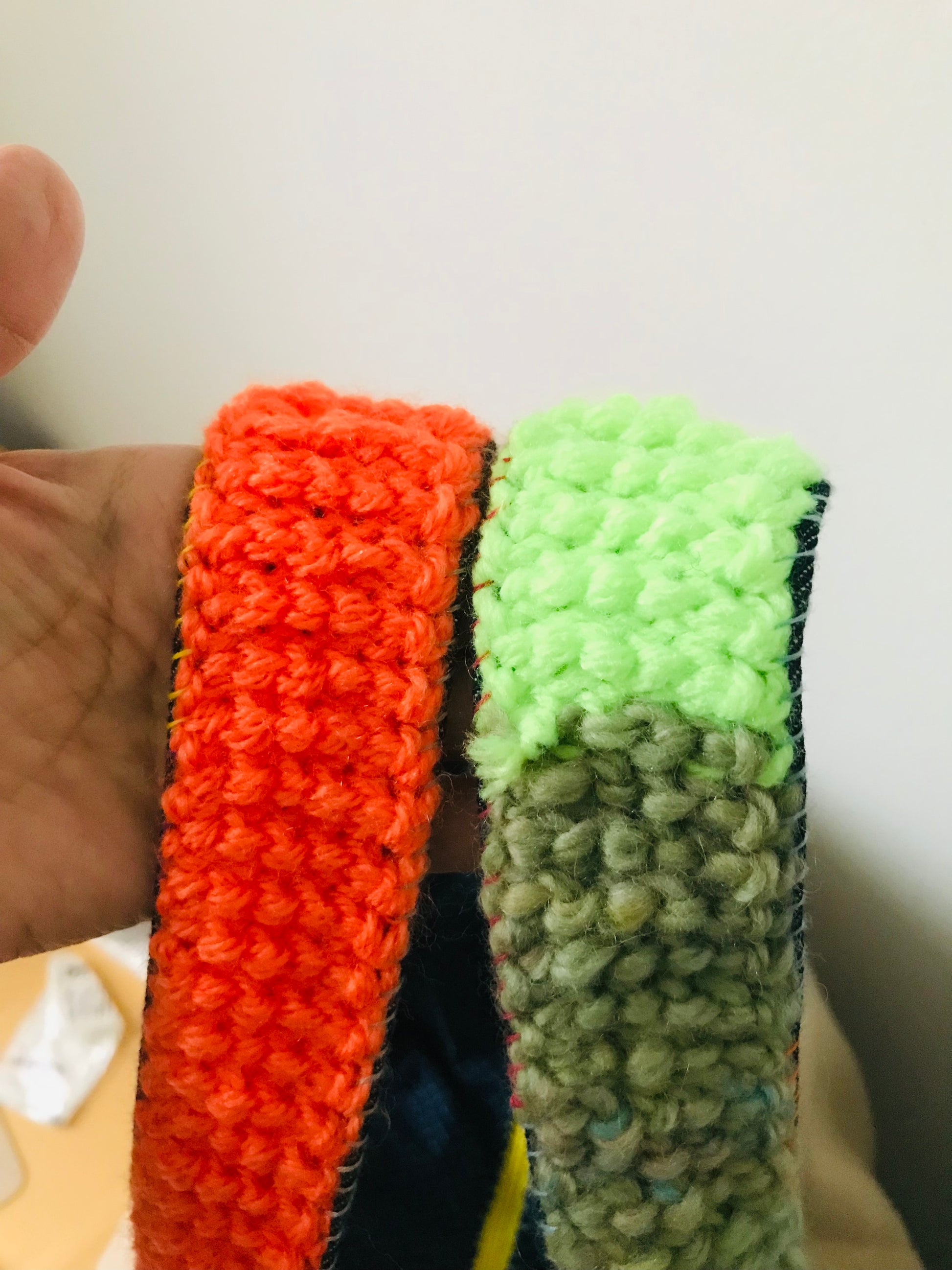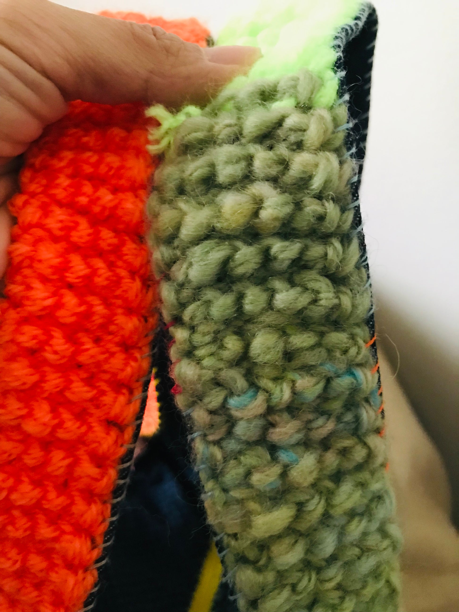 持ち手のアフガン編みで使っているのはネオンの糸と、大切な緑の手紡ぎ糸。ふかふかな感じが手に優しいです🫲
