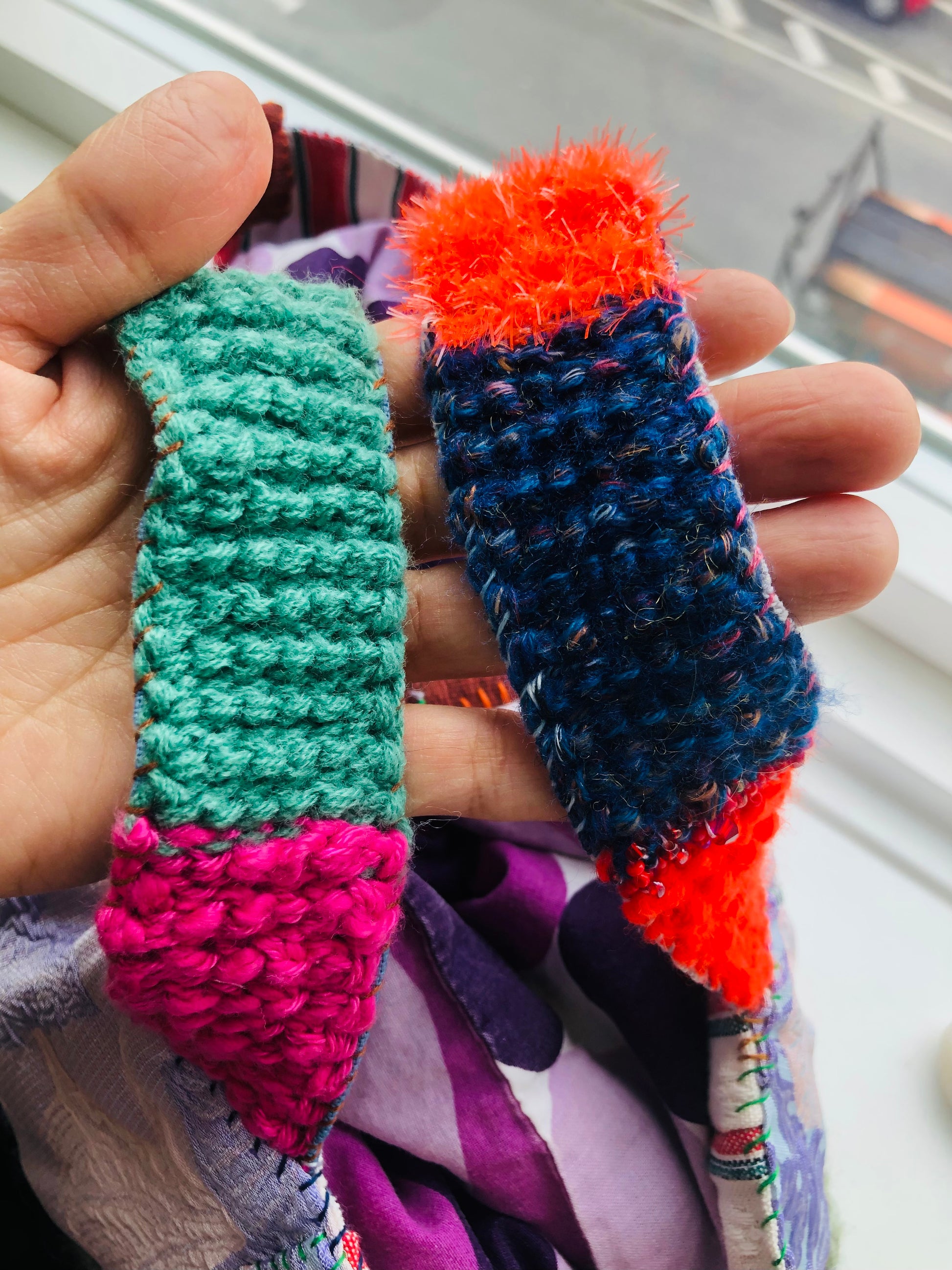 ⭕️持ち手はカラフルな毛糸で編みました。編み物なので裏に補強済み。