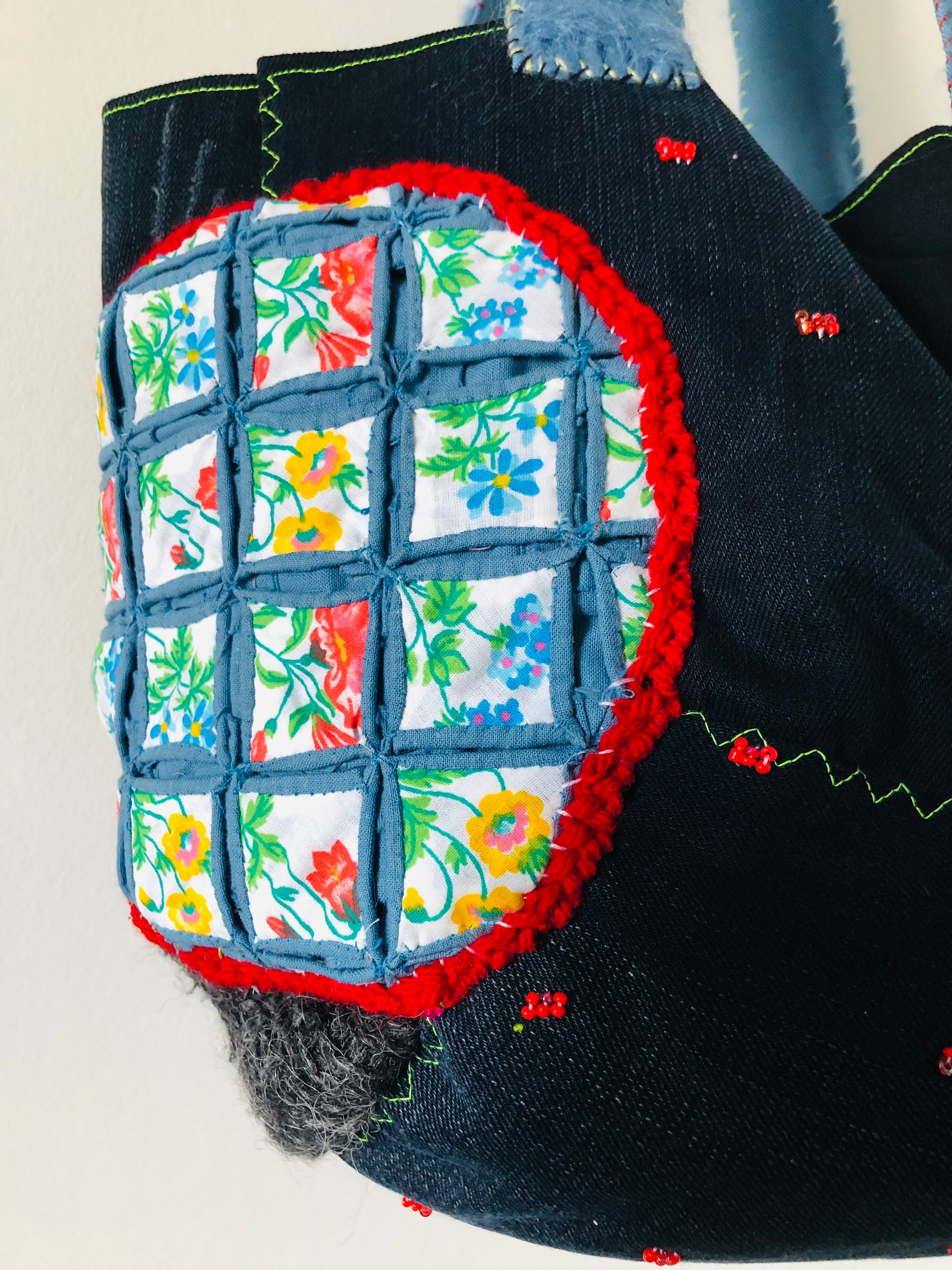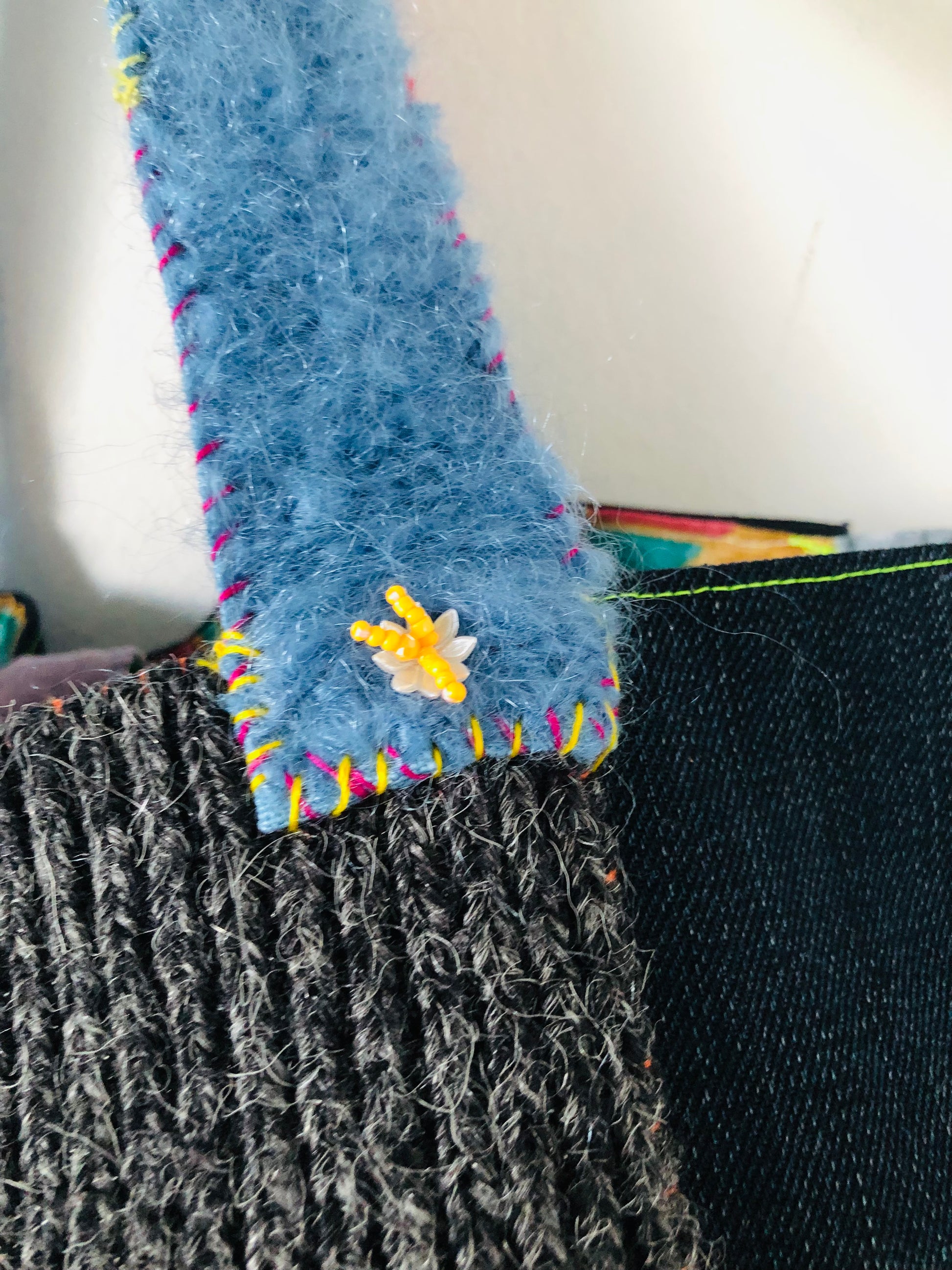 なんか淋しく感じた黒のデニム生地には赤いビーズを配列。