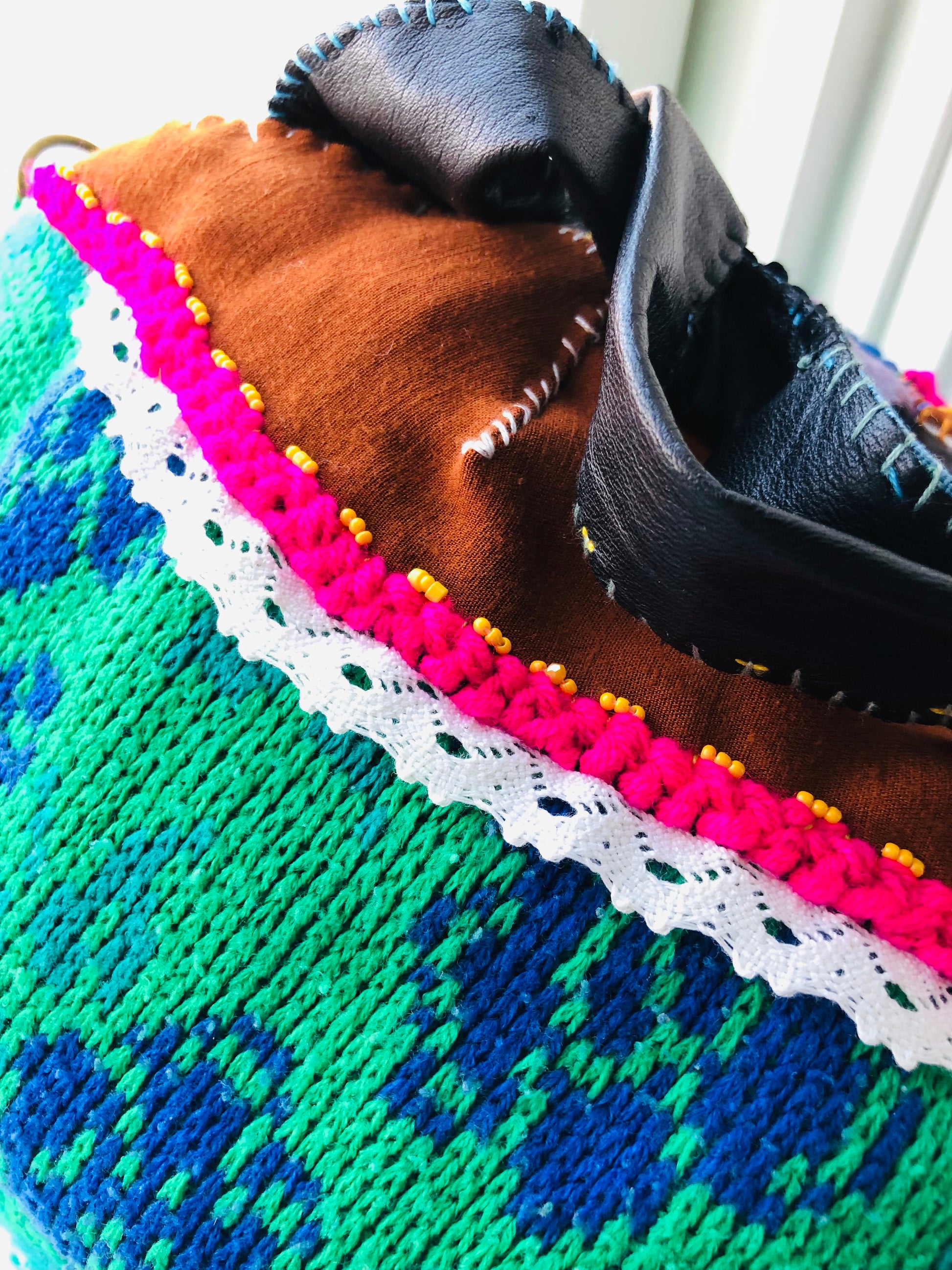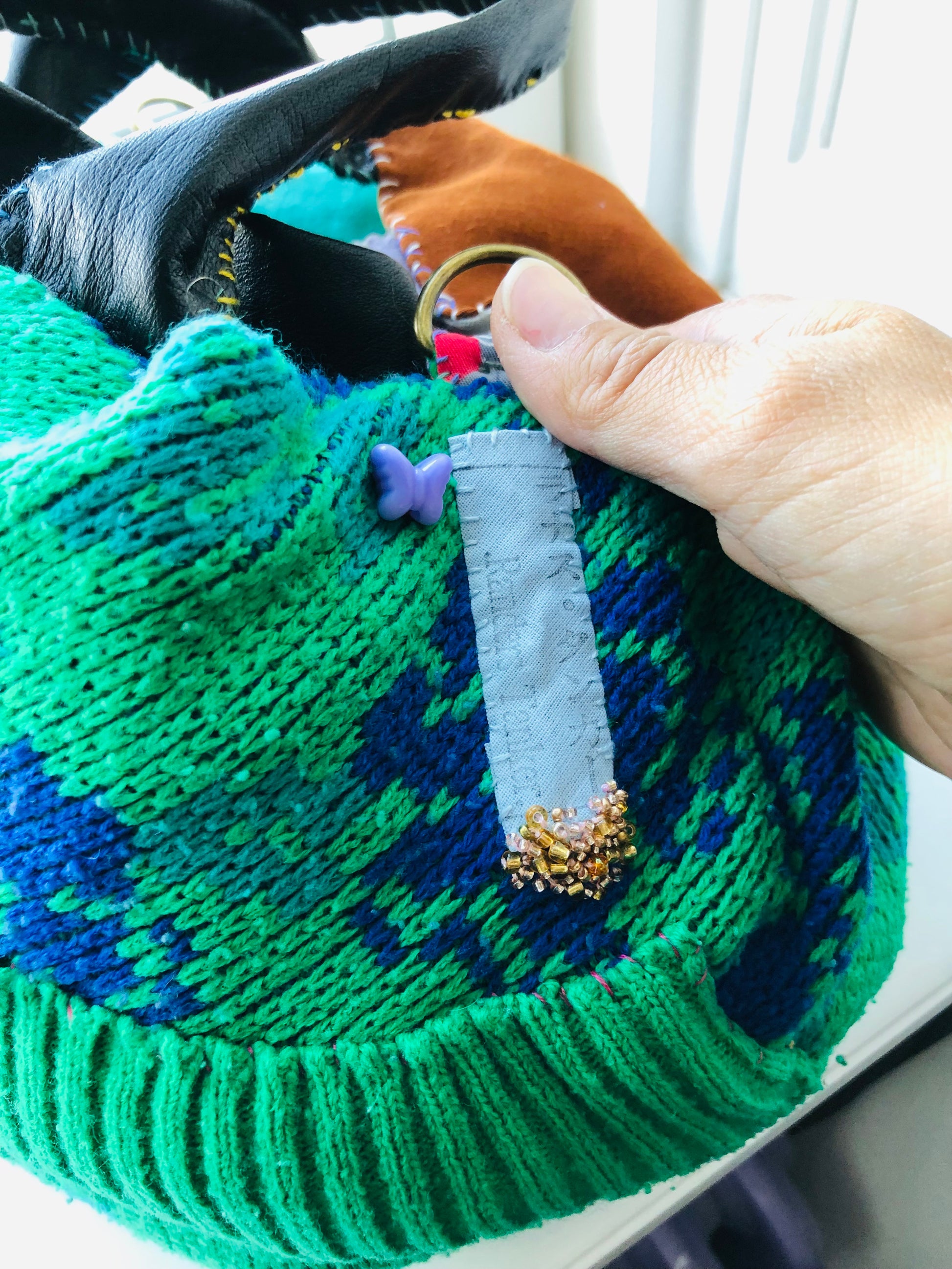 さまざまな種類の生地を使用しています。いくつか色落ちする素材もございます。(革部分など)