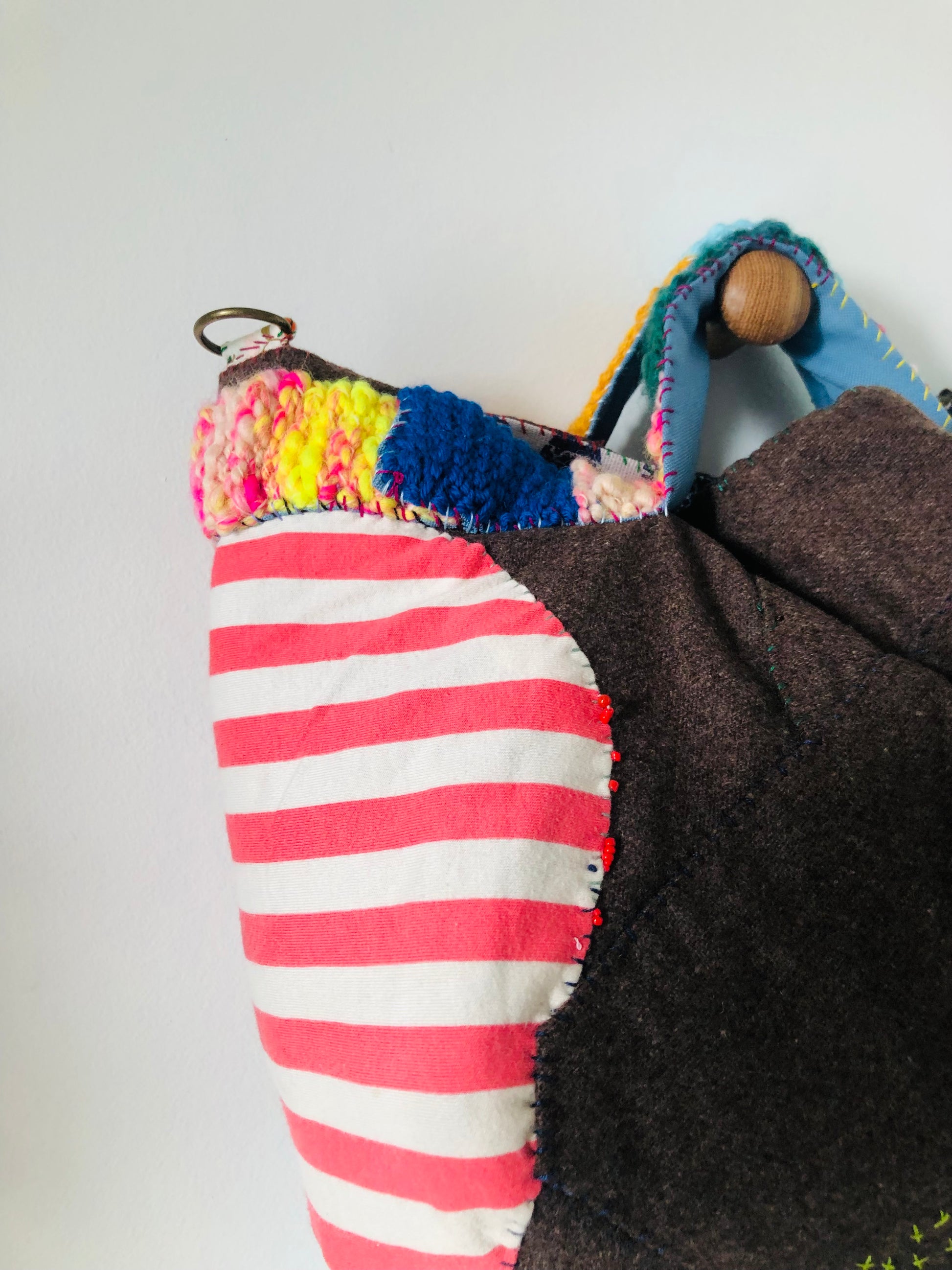 さまざまな種類の生地を使用しています。いくつか色落ちする素材もございます。(革部分など)