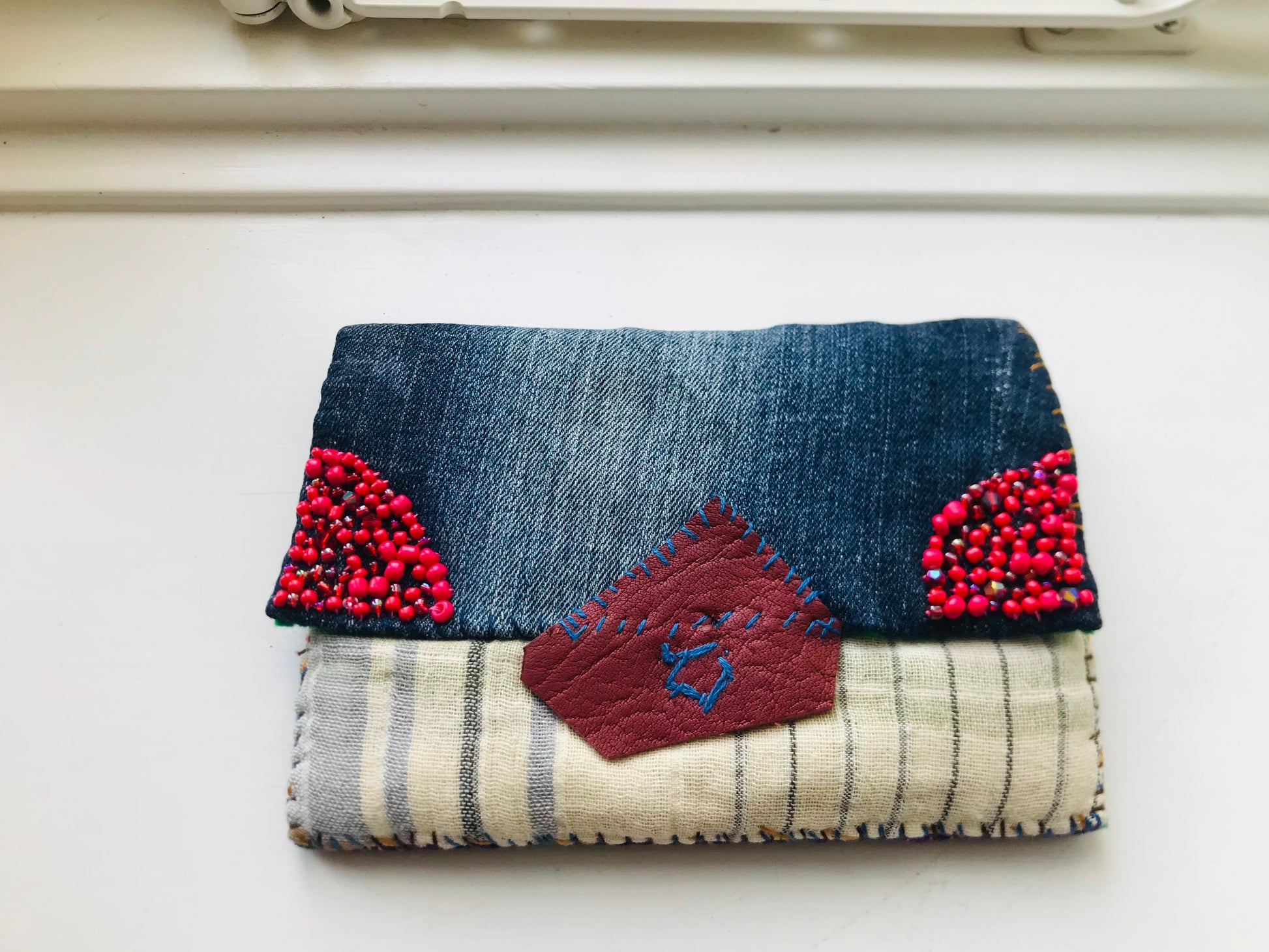 ✨いい味デニム、使いました👍デニムには赤でしょう、という事で赤ビーズで飾ったけど、やはり大正解。ビーズの種類が色々なので光ったら、ためらったりw表情が皆違ってて、とても良い✨