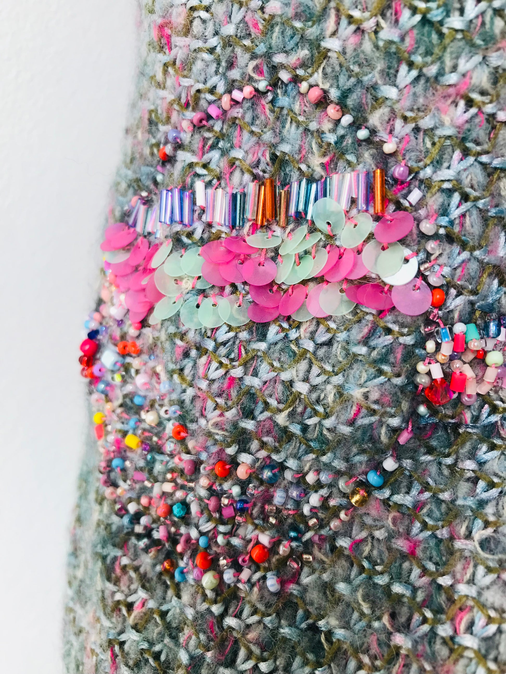 丸から丸を繋ぐようにビーズで飾ったのと、ジッパーで閉じられるデザインがポイント。